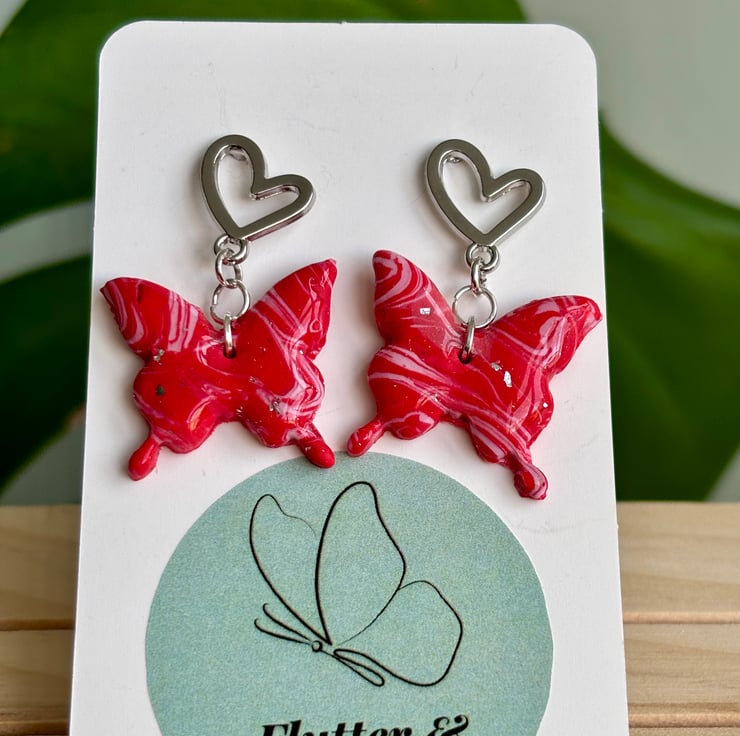 A pair of striking butterfly earrings, handmade in glossy red polymer clay with a marbled finish and delicate wing details. Each butterfly dangles from a silver colour heart stud — a sweet, romantic touch that adds elegance and charm.