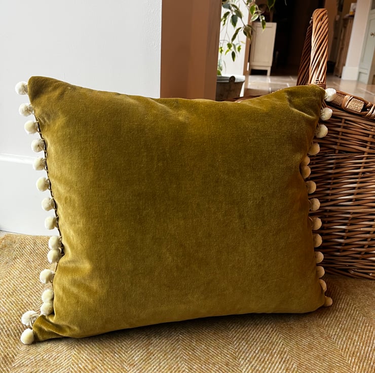 One of a kind cushion cover with a large panel of repurposed needlepoint with a striking design of a boat and a cottage in earthy colours. I have combined it with reclaimed olive green velvet from a curtain. The ends of the cover are trimmed with velvety cream pompoms.