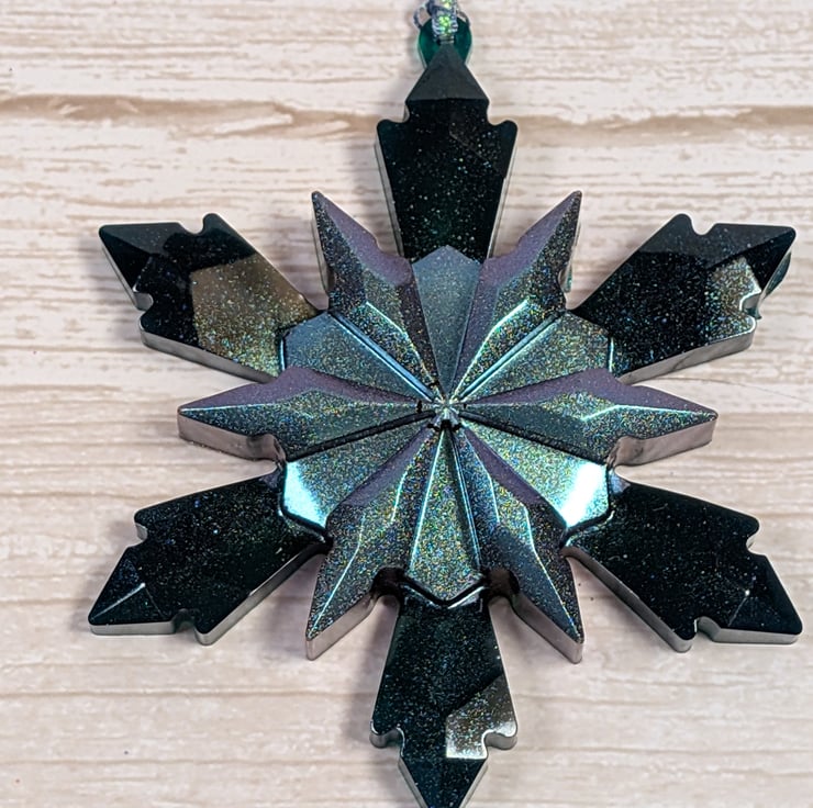 This snowflake is made by hand in small batches using clear epoxy resin and high quality pigments. Every one comes out slightly different, which means the one you choose is genuinely one of a kind. The design is a solid three dimensional shape with raised faceted details that catch the light beautifully. It works well on Christmas trees, winter branches, garlands, and gift wrapping, and can be displayed long after the festive season.