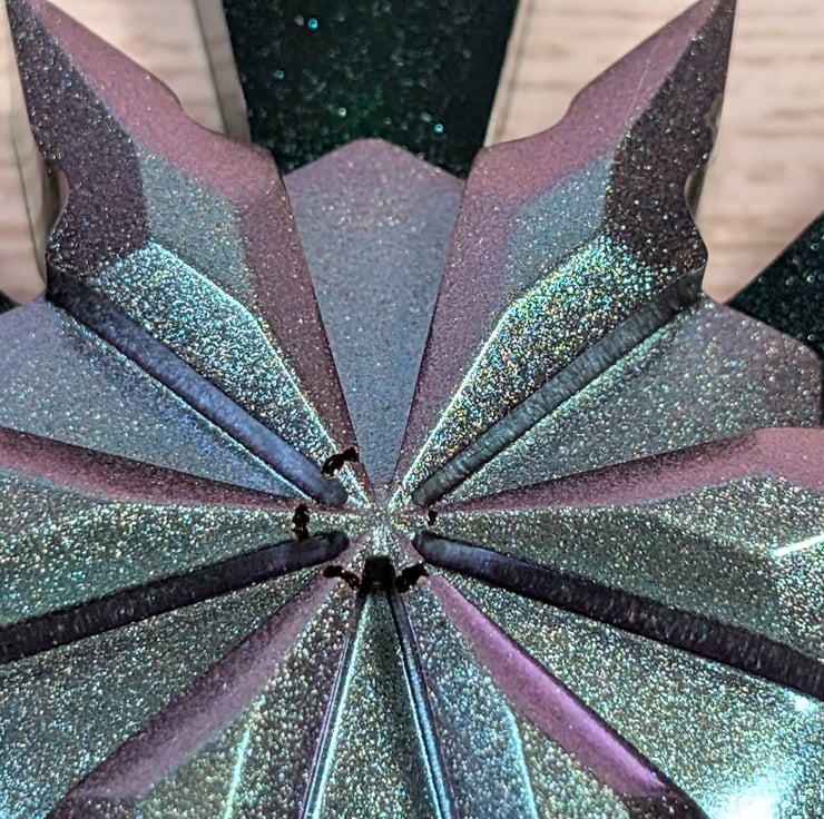 Each ornament is poured in two layers so the centre and outer points have depth and variation. Some have soft shimmering mica, some have bold glitter, and some are completely clear with colour suspended inside. The resin cures to a glossy finish and feels weighty and smooth in the hand. Colours and patterns vary with each piece and the piece you receive may vary slightly from the photo.