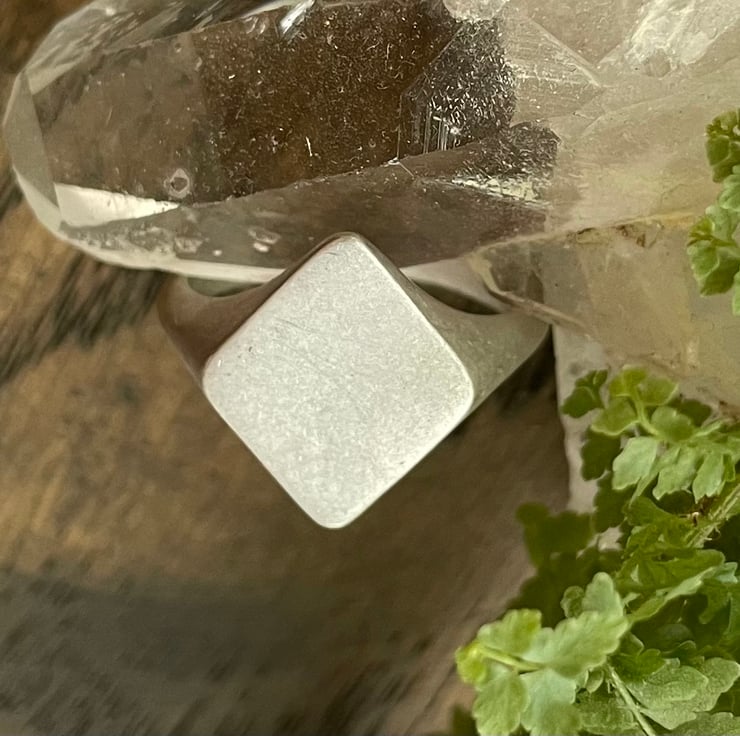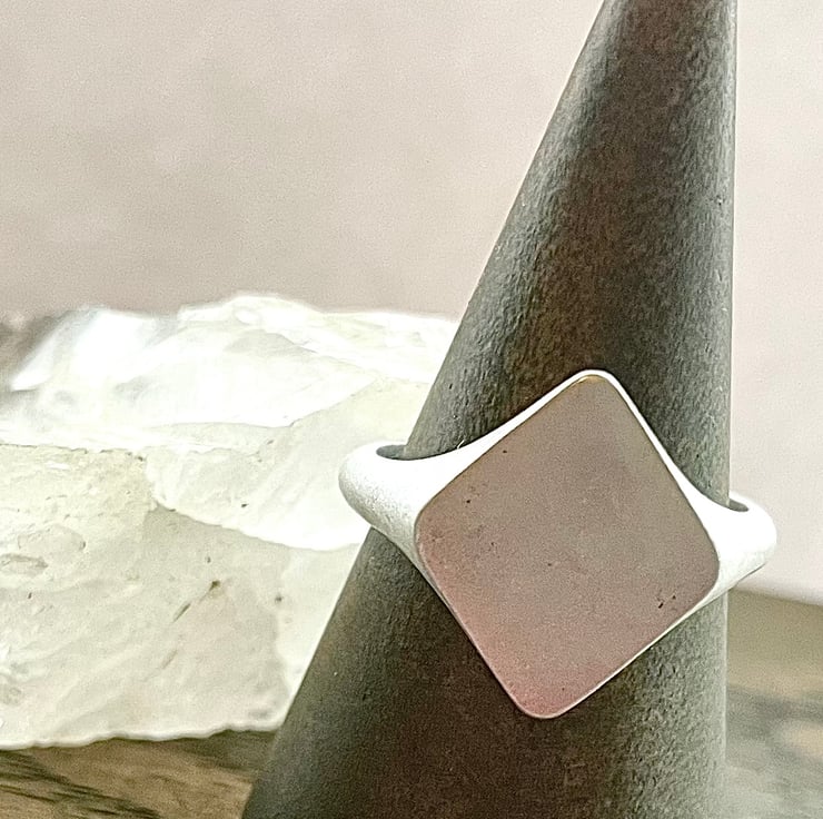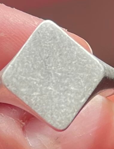 This signet ring has a frosted look. Size 0 is available. Other sizes can be made on request.
