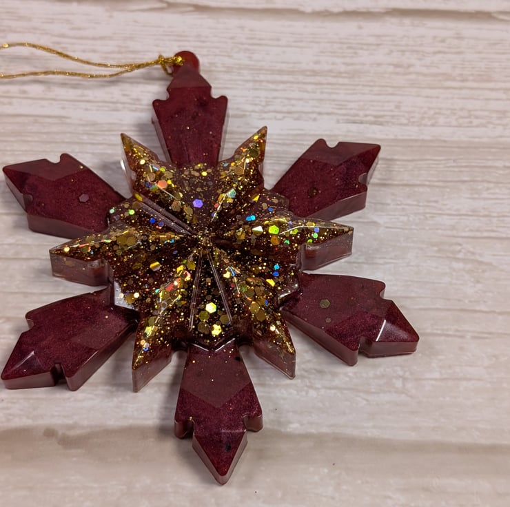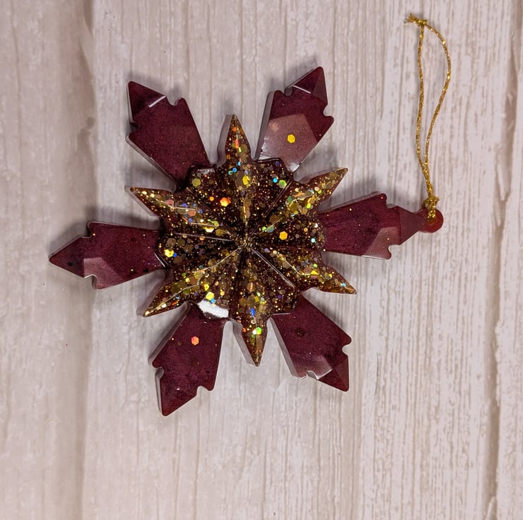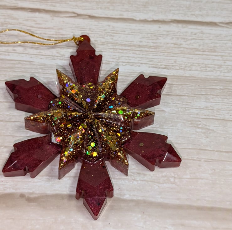 This snowflake is made by hand in small batches using clear epoxy resin and high quality pigments. Every one comes out slightly different, which means the one you choose is genuinely one of a kind. The design is a solid three dimensional shape with raised faceted details that catch the light beautifully. It works well on Christmas trees, winter branches, garlands, and gift wrapping, and can be displayed long after the festive season.