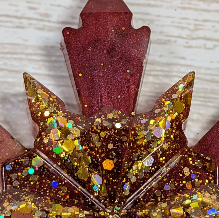 Each ornament is poured in two layers so the centre and outer points have depth and variation. Some have soft shimmering mica, some have bold glitter, and some are completely clear with colour suspended inside. The resin cures to a glossy finish and feels weighty and smooth in the hand. Colours and patterns vary with each piece and the piece you receive may vary slightly from the photo.