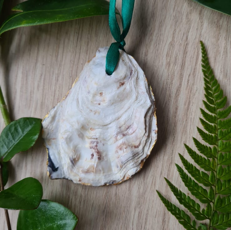 This oyster shell hanging decoration has been decorated with decoupage using a pretty woodland design featuring a lovely deer. I have painted the edge in gold paint, sealed it with gloss varnish and finished the decoration with a matching green ribbon. I have varnished the back so you can see the lovely natural colours of the shell.