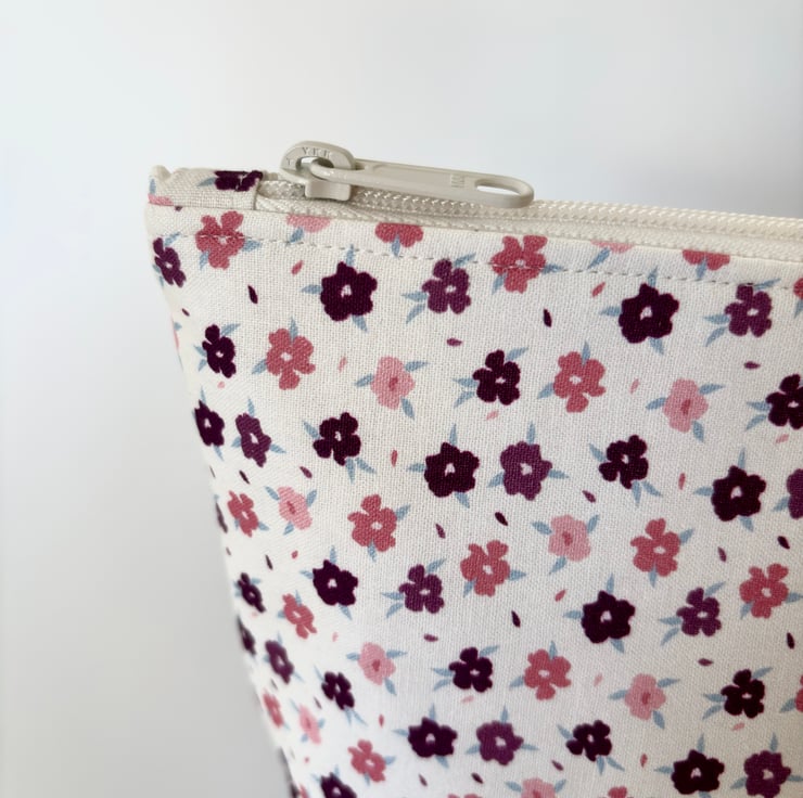 Handmade zipped fabric pouch perfect for make up or small toiletries, in a beautiful fabric design of pink and purple flowers on a cream background.