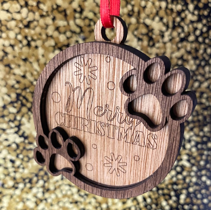 This is the perfect Christmas decoration or gift for dog lovers. These baubles can be placed on the tree to celebrate or remember your loving pets. The baubles are made from multiple layers of hardwood and stained in natural Oak and Hazelnut with the words "Merry Christmas" and engraved in the centre, and Paw Prints decorating the outer ring.