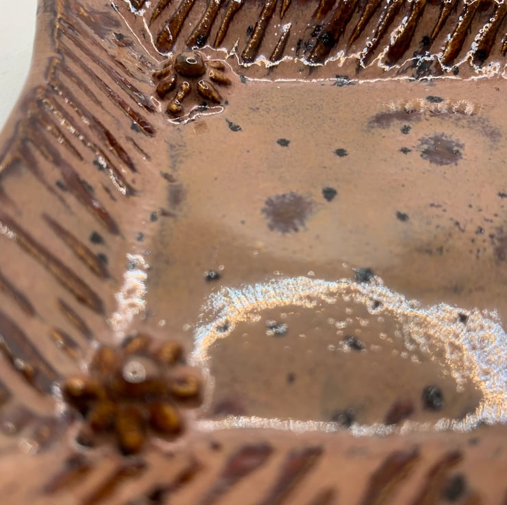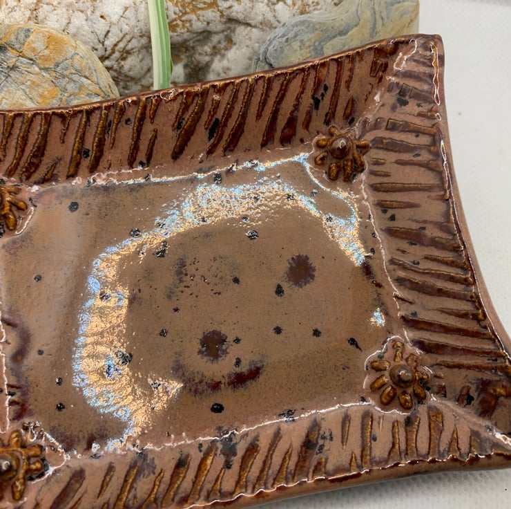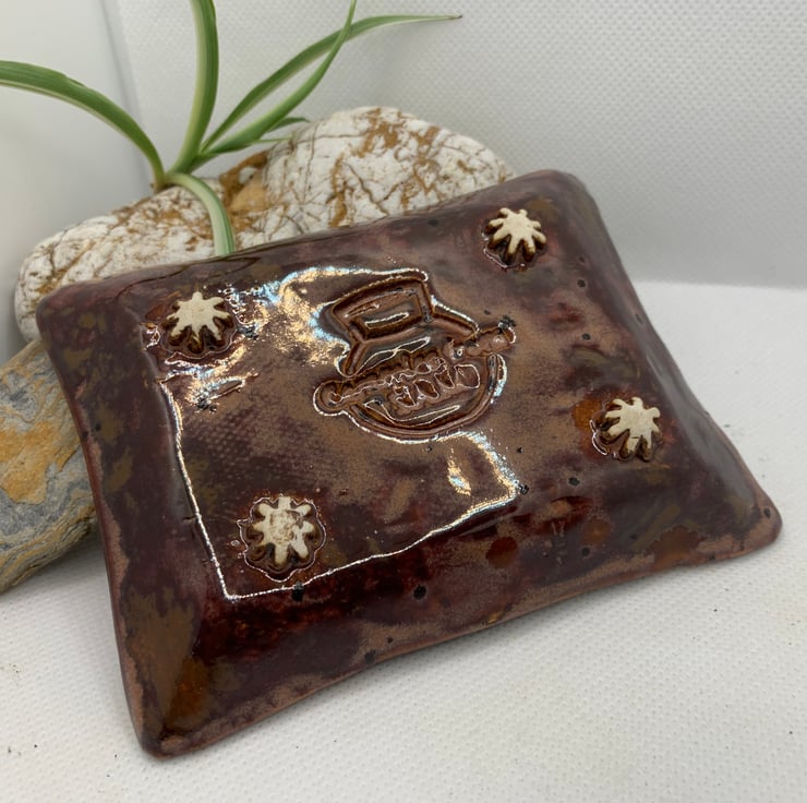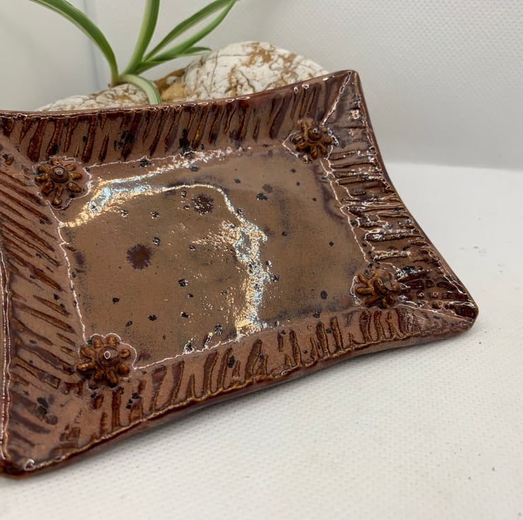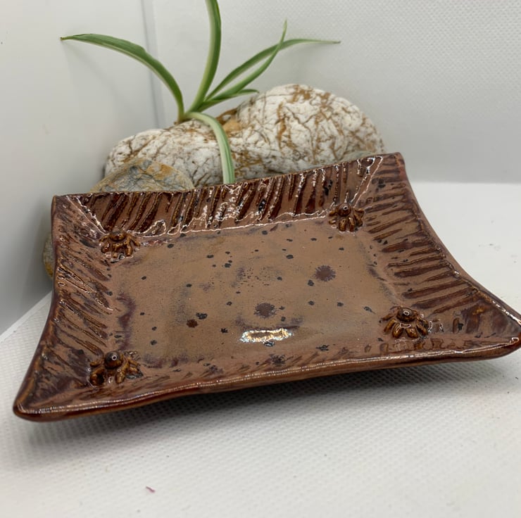 A small teabag dish to keep those pesky soggy teabags off your worktops! Pretty colour with flowers in the corners for added interest. 4.5 ins x 3.5 ins. Could also be used as a ring dish to have by your sink or even a dish for keeping keys safe on the hall table.