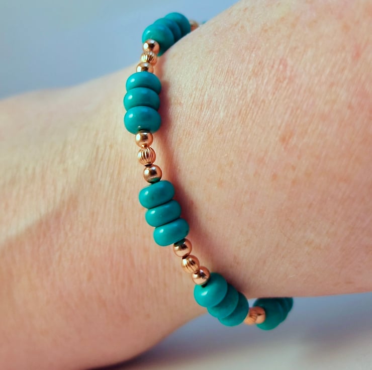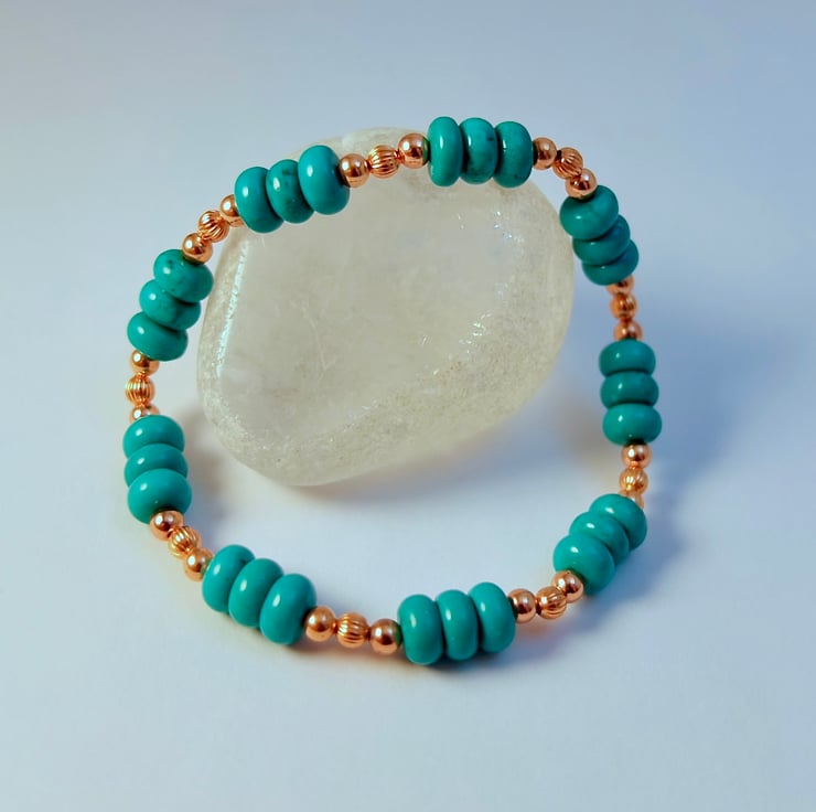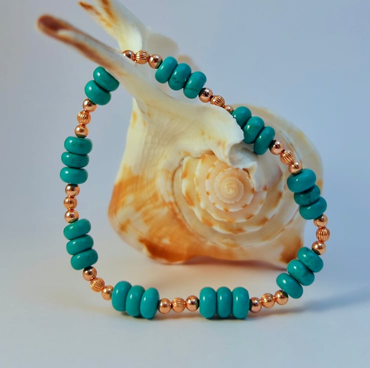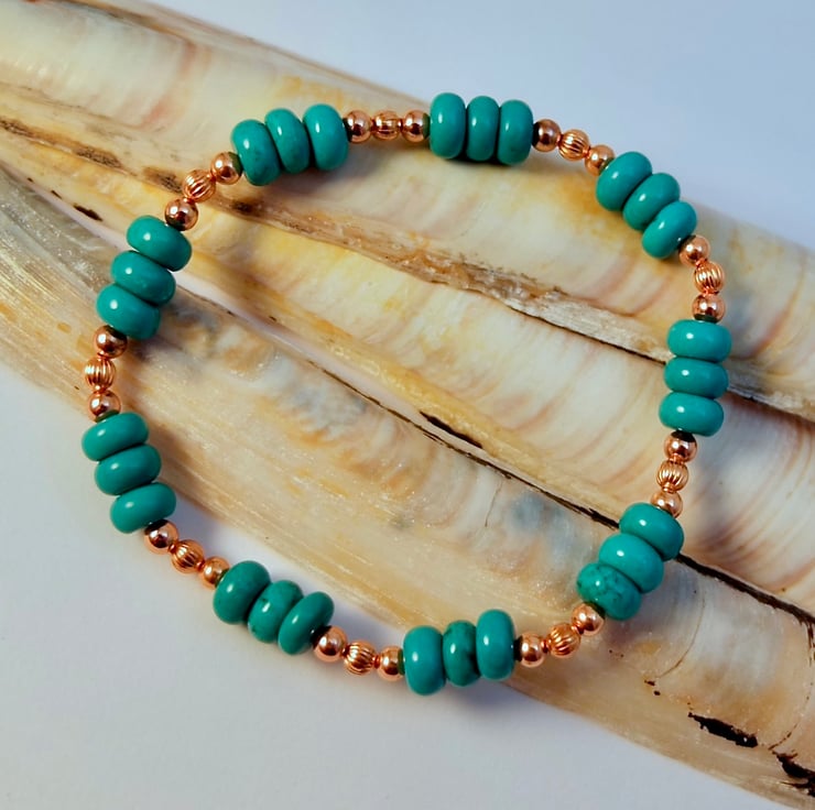 This striking bracelet features 6x4mm rondelles of genuine Hubei Province Turquoise, separated by trios of 3mm pure copper beads.