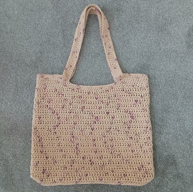 The bag is crochet using Divante Ombre Cotton yarn in shade Cream Ombre. The yarn is 100% cotton. The bag measures length (excl handles): 35.5 cm or 15 inches and width: 30.5 cm or 12 inches.
