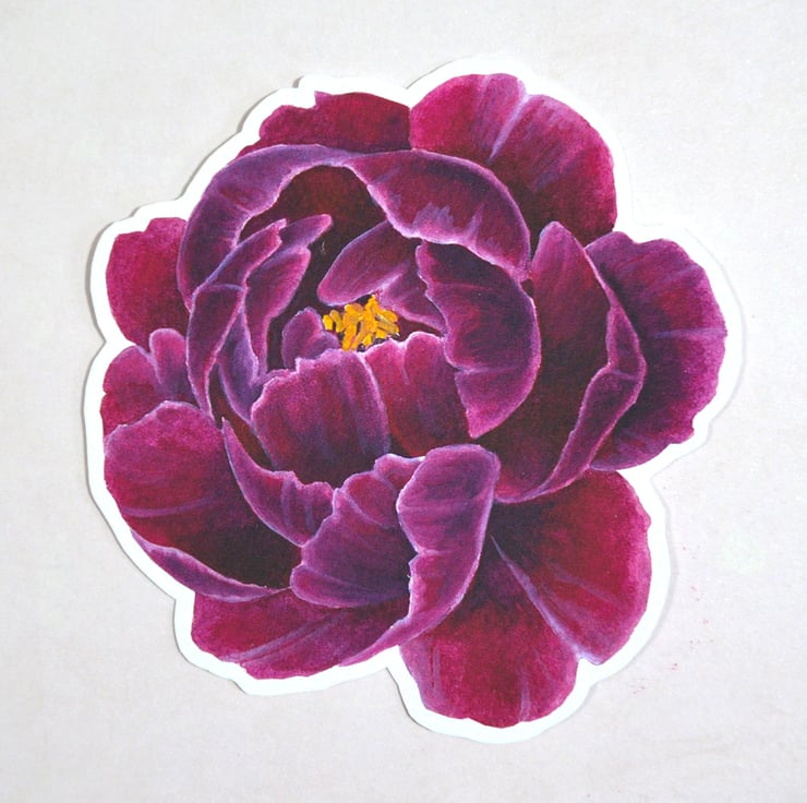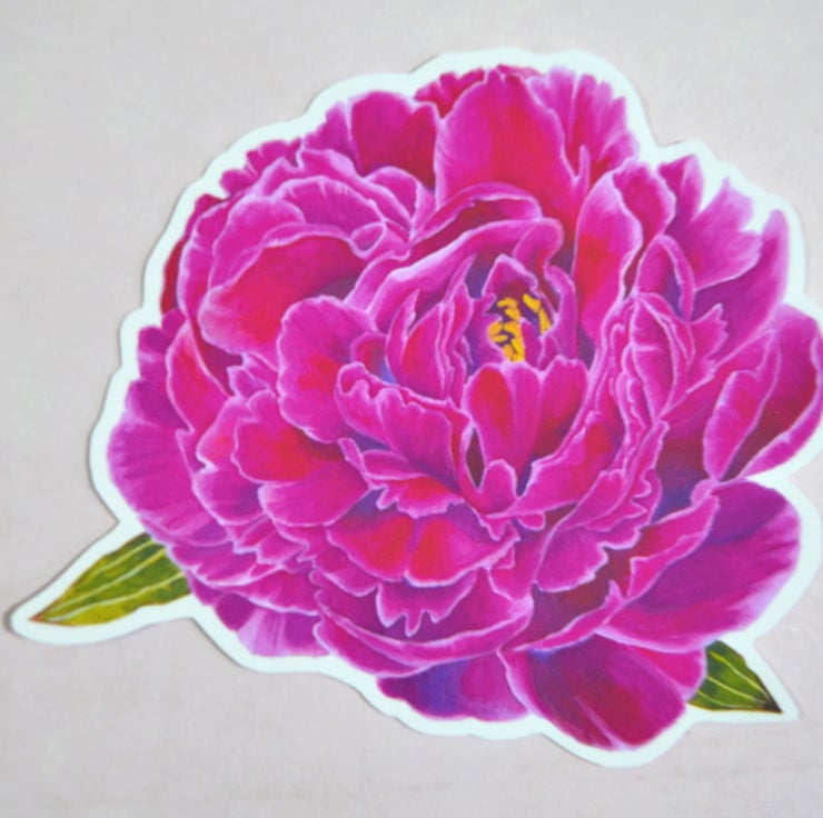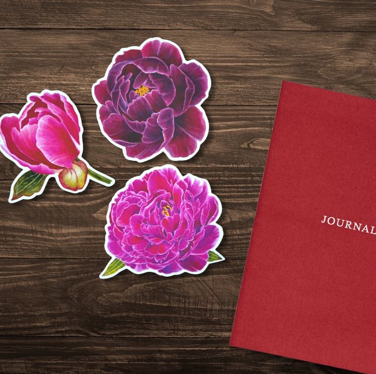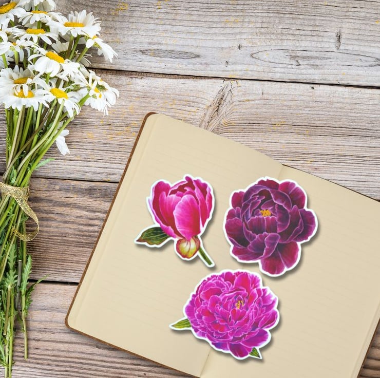Add a little floral loveliness to your items with these peony flowers botanical nature inspired stickers. This set of three floral stickers feature a deep pink peony, a deep red peony and an opening peony, exclusively designed from original watercolour and gouache botanical floral illustrations. Designed for you to have fun decorating your items, these botanical art stickers will brighten up drinks bottles, tech items, journals etc.