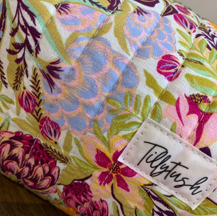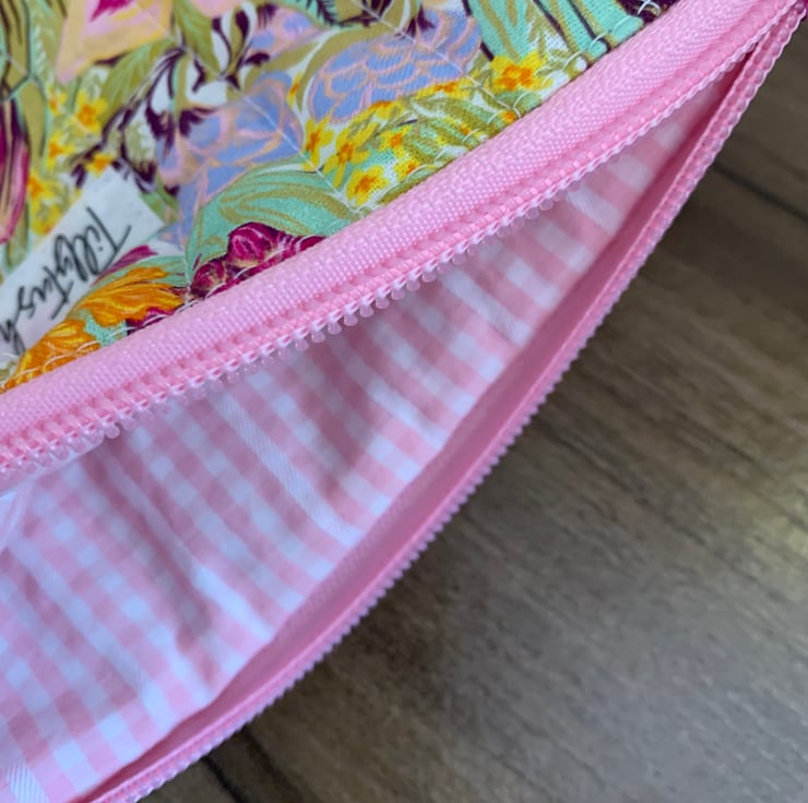 Charming makeup pouch in a beautifully vibrant floral design in pinks and greens.