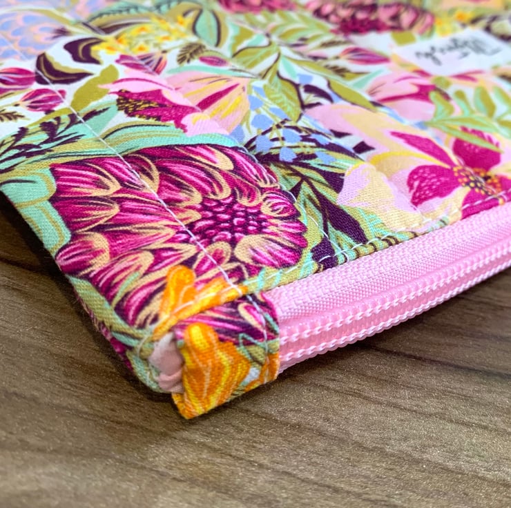 This handmade pouch has an exterior made from premium cotton and has a vertical line quilting design, secure zip closure.