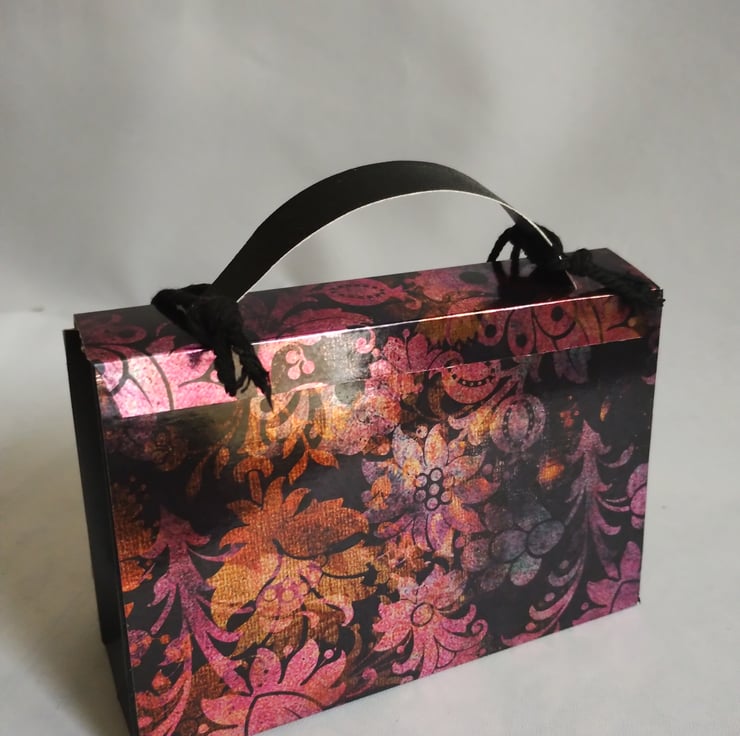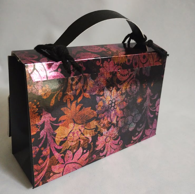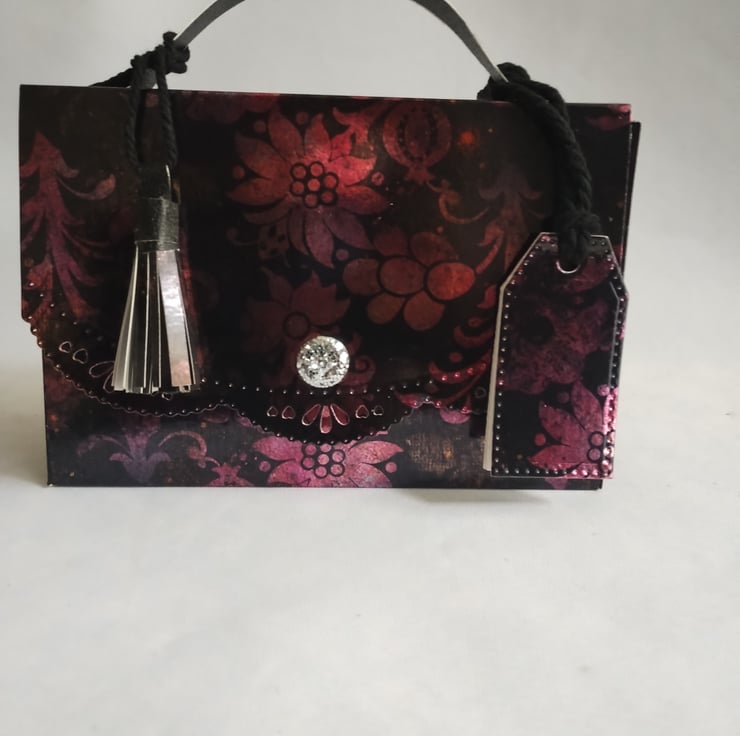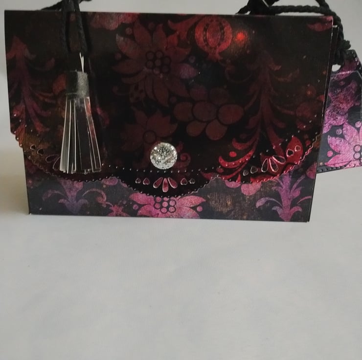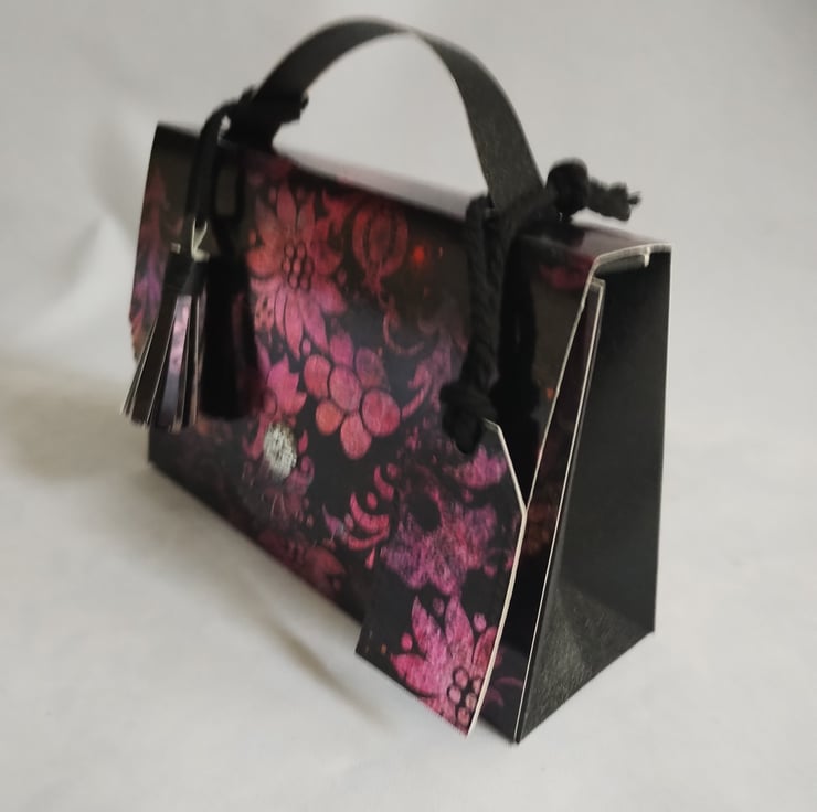 I've made this gift bag with super shiny mirri card with a beautiful black and pink floral pattern. I've cut a fancy edge flap and added a glittery 'button' faux fastener. It comes complete with matching paper tassel and gift tags for your message to the recipient.