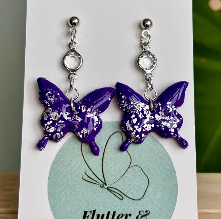 A pair of delicate butterfly earrings, handmade in purple polymer clay with shimmering silver foil flakes. Each butterfly dangles from a clear bead, catching the light like morning dew on wings. Lightweight and full of movement, they’re perfect for adding a touch of magic to any outfit.
