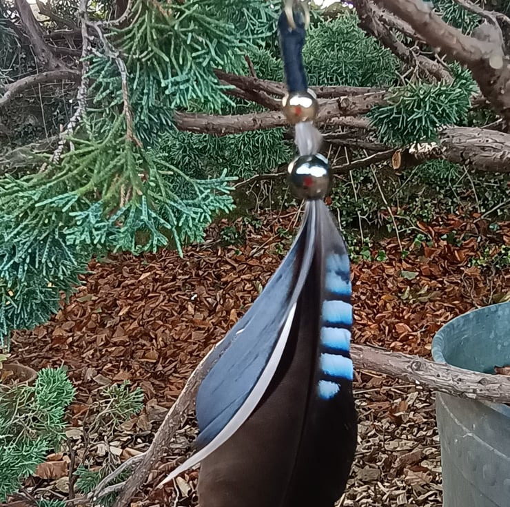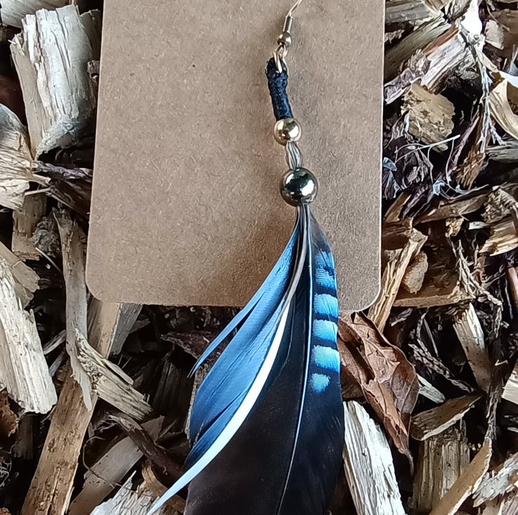 This striking feather earring is a one-off piece made with a jay feather and other feathers.