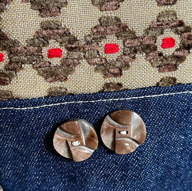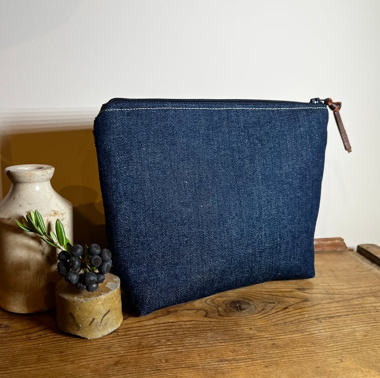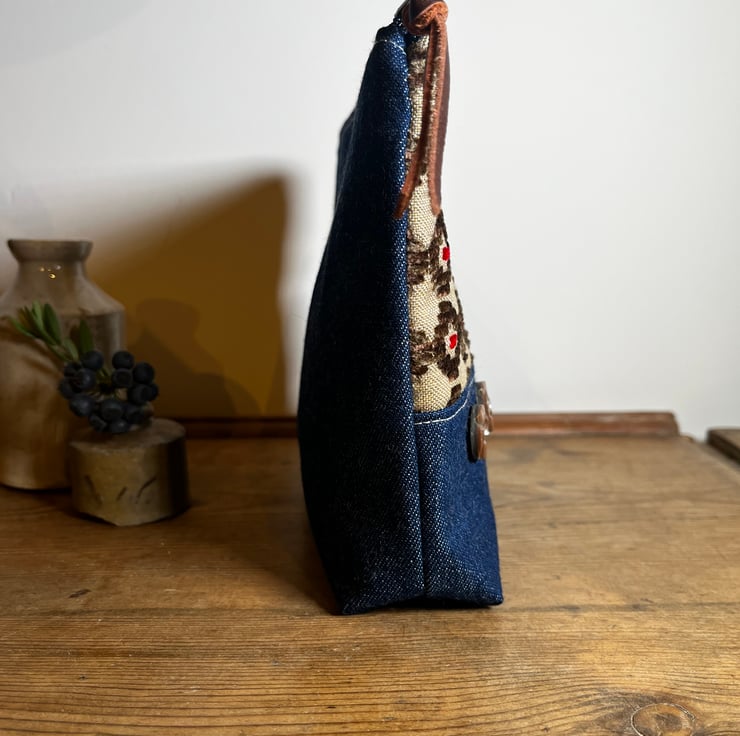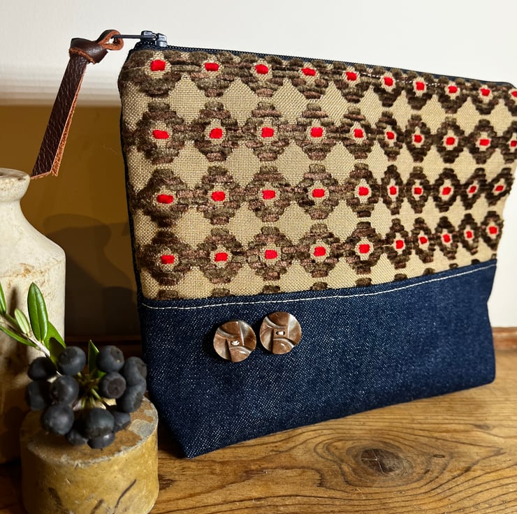 One of a kind zip pouch made from a sample swatch of textured chenille upholstery fabric and dark blue denim. Two vintage buttons decorate the front and the zip pull has a strip of leather which was from offcuts from my local upholsterer. The back is plain denim.