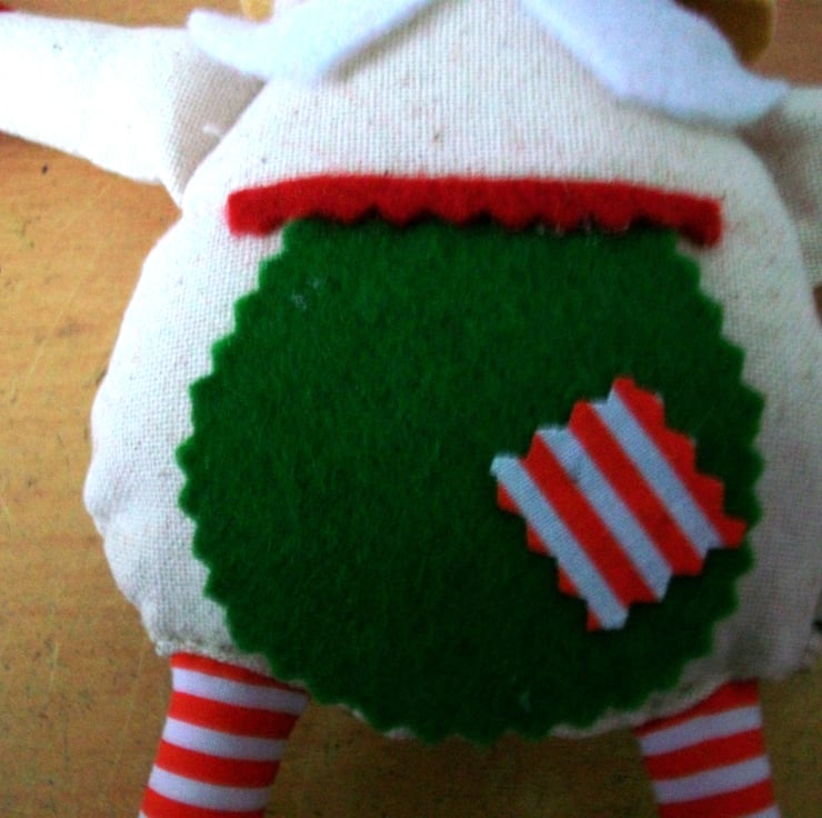 HIS BODY IS MADE FROM NATURAL OSNABURG FABRIC ON WHICH A GREEN FELT ARON IS WORN. A CANDY STRIPED PATCH DECORATES THE APRON