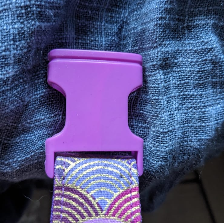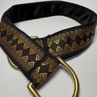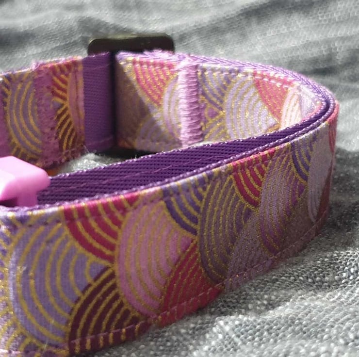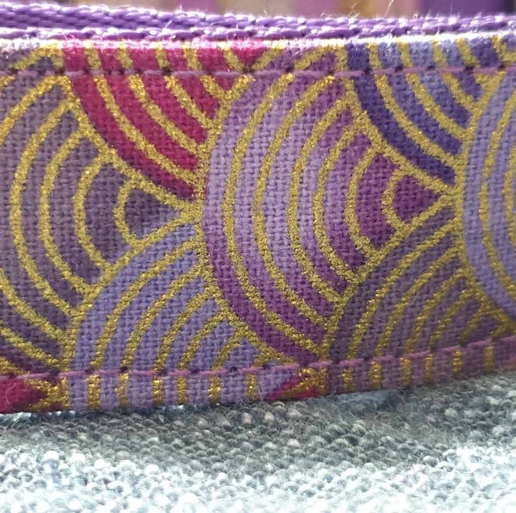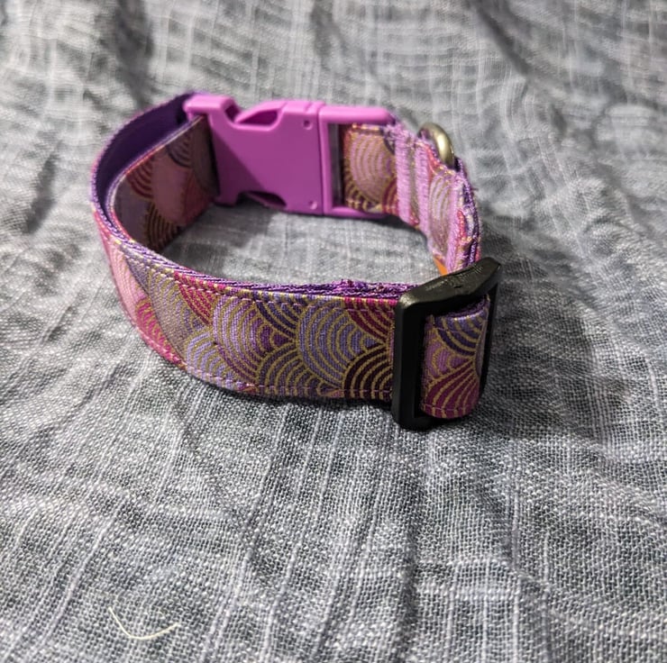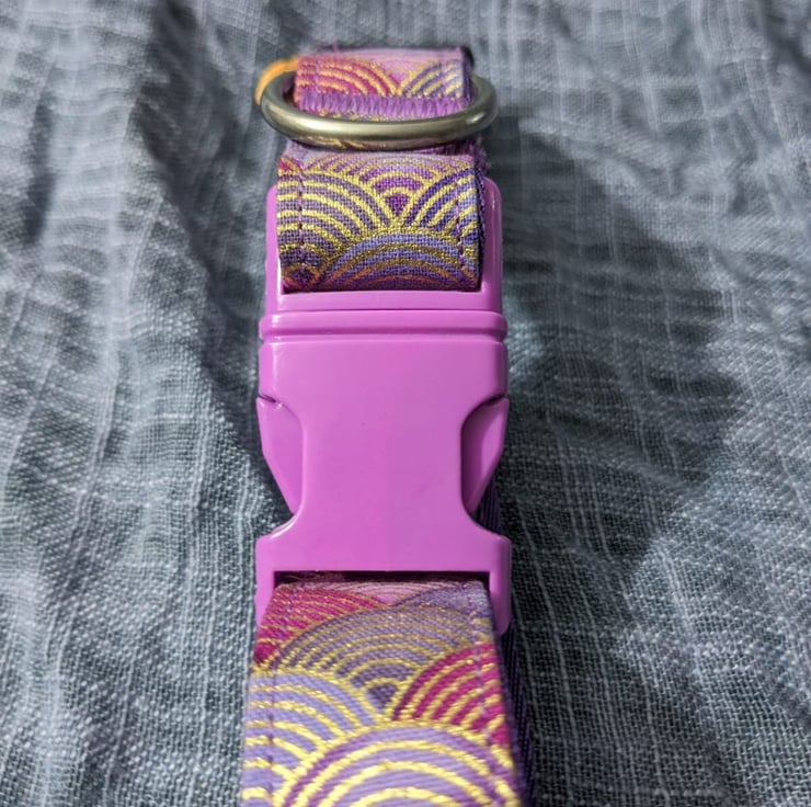 Crafted for comfort and durability, this medium-sized dog collar features a graceful arc design in gold, yellow, and purple tones—securely sewn onto tough polypropylene webbing. The welded steel D-ring offers reliable strength for everyday walks, while the matching purple buckle adds a touch of coordinated charm.