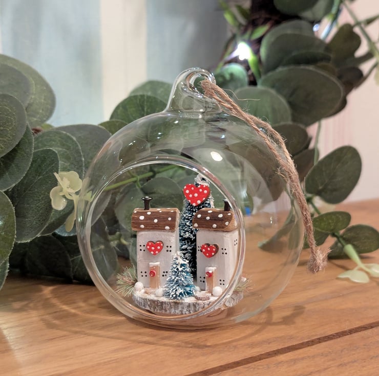 Inside the bauble on a rustic wood slice is a cosy snowy cottage scene with two small cottages with nail chimneys and bead wreaths on the doors.