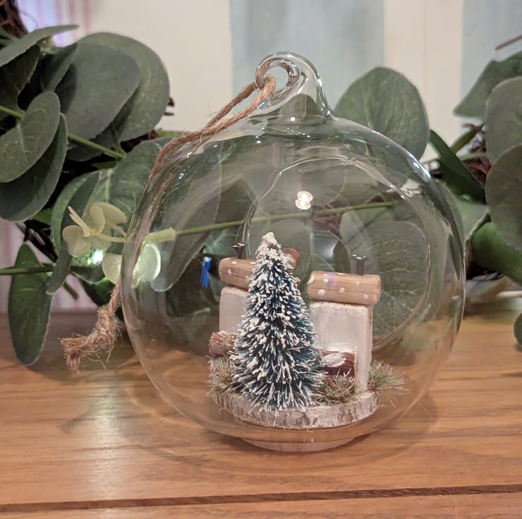 The glass bauble is opened fronted and is freestanding on a wood slice base or can be hung up.