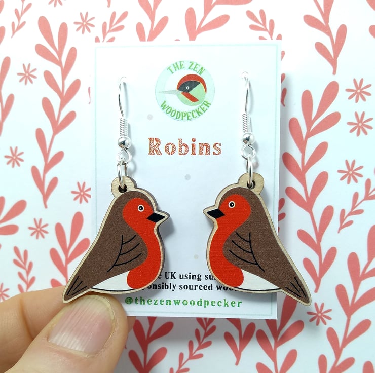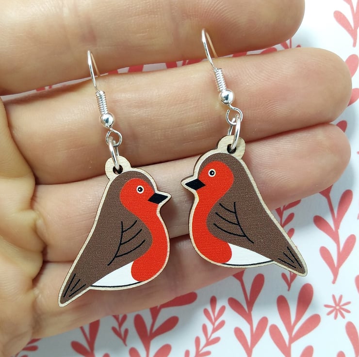 Robin Drop Earrings, Wooden Dangly, Silver Plated or Sterling Silver Hooks