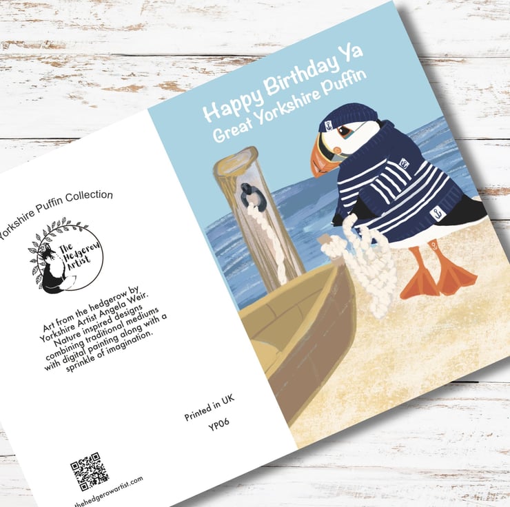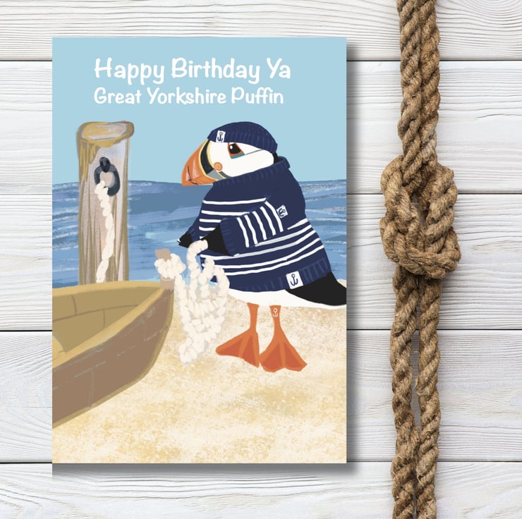 A NEW great fun illustration of my very popular yorkshire puffin in his bretton jumper. Blank inside for your own message