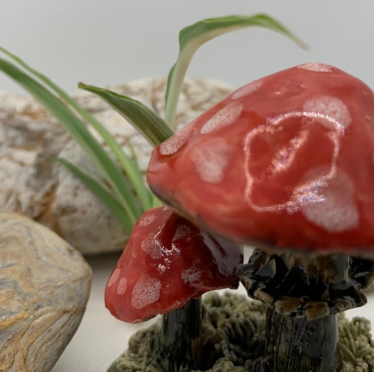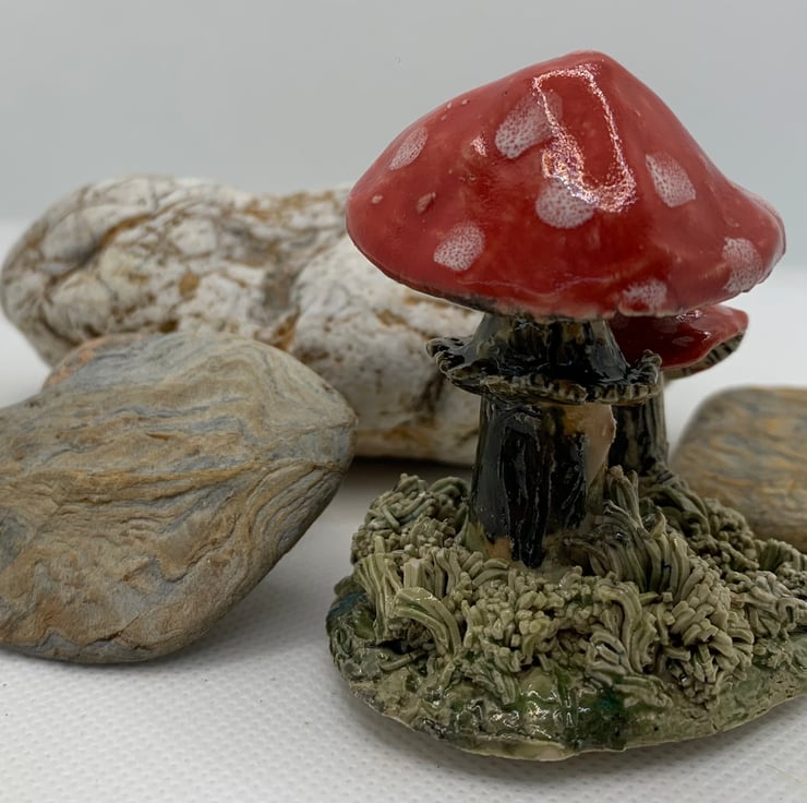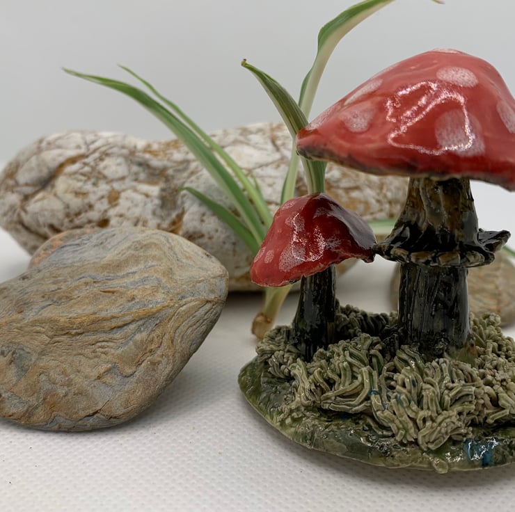 A cute whimsical ornament featuring two toadstools. Made from stoneware clay so can be used outdoors. The ornament is 3 ins high.