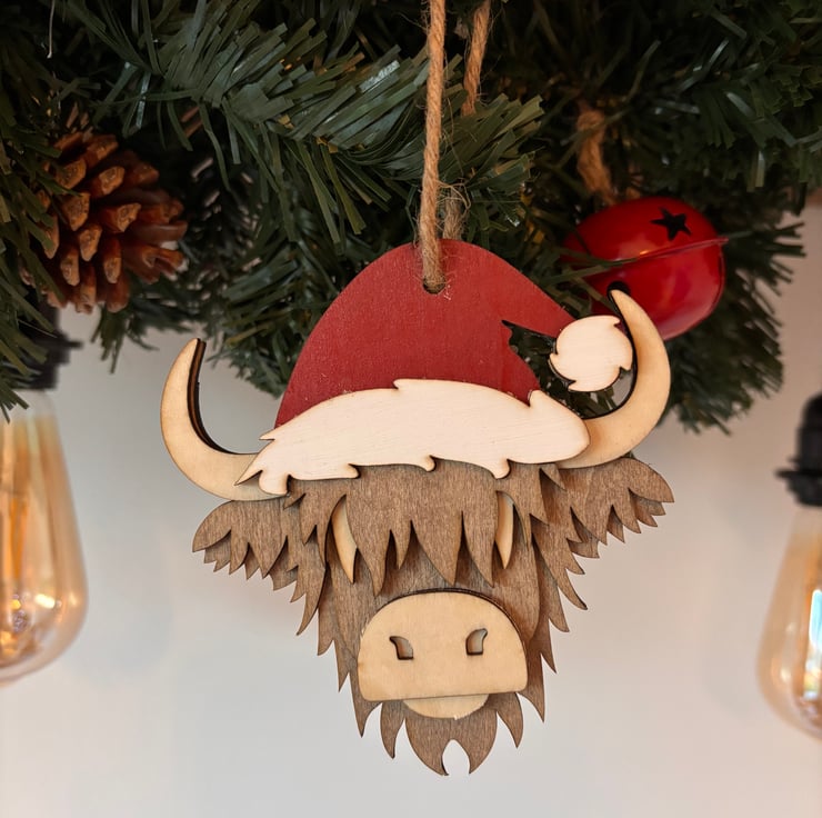 Add rustic charm to your holiday décor with this adorable Highland Cow Christmas Tree Decoration. Made from high-quality plywood, it features a detailed laser-cut design of a Highland cow wearing a festive Christmas hat, with each piece showcasing its own natural wood grain.