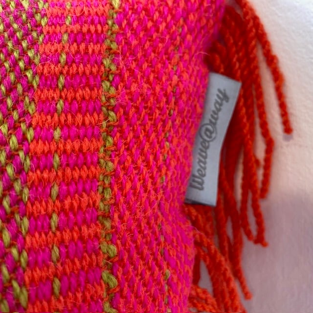 Bright orange, lime green and fushia pink ,combine together in this hand woven cushion cover. Featuring a hidden zip and fun fringing details. Comes complete with a UK made Eco inner pad.