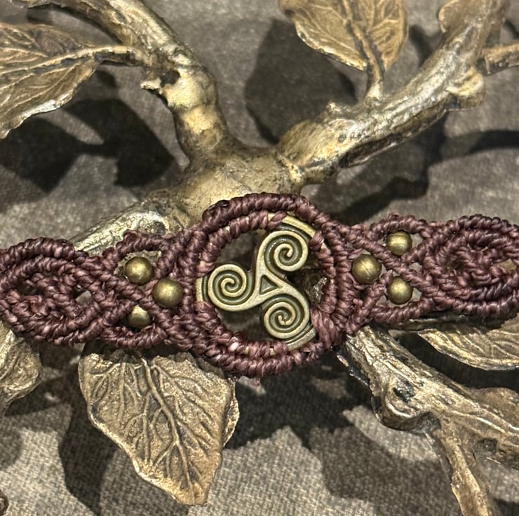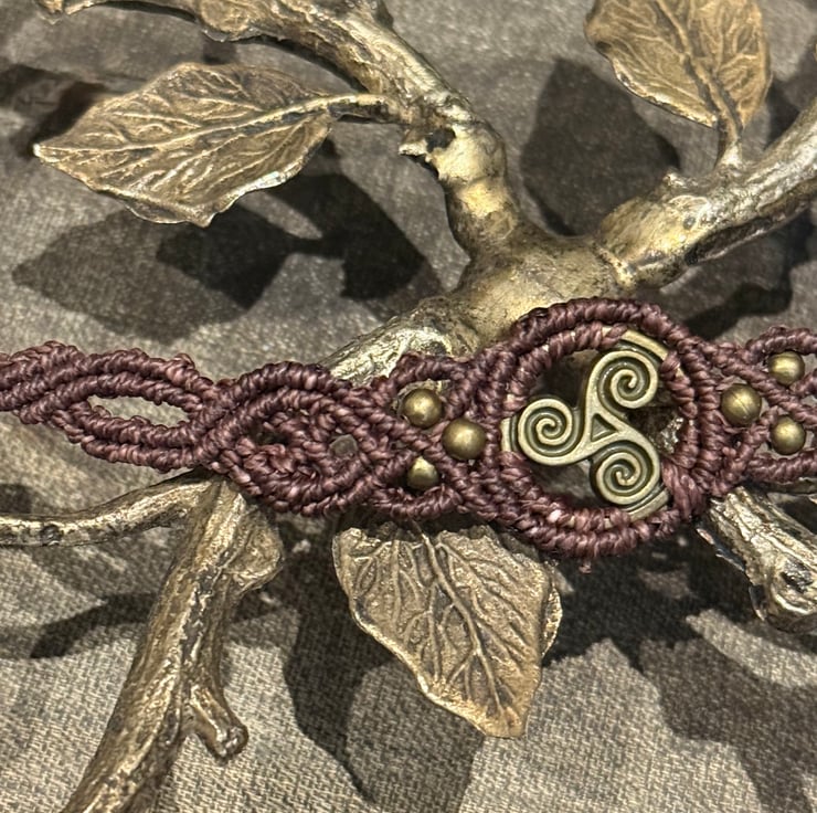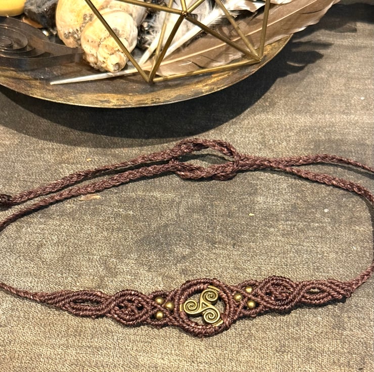 A beautiful intricate macrame choker necklace in brown waxed cord, with vintage look brass beads, and featuring a triskele spiral detail at its centre.
