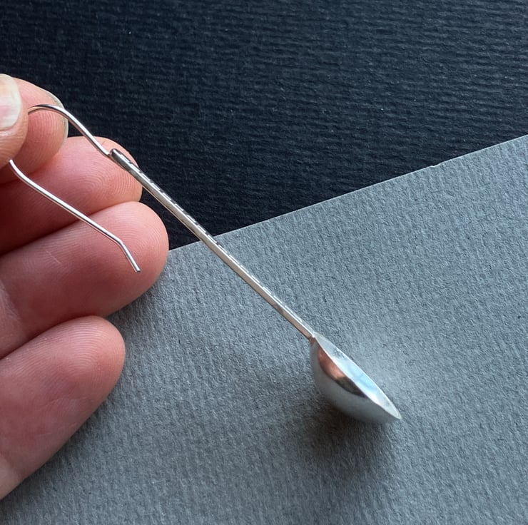 My spoon earrings and abstract spoon earrings are all inspired by my collection of spoons and some of my larger work. These are hand fabricated from sheet and wire and hand stamped.