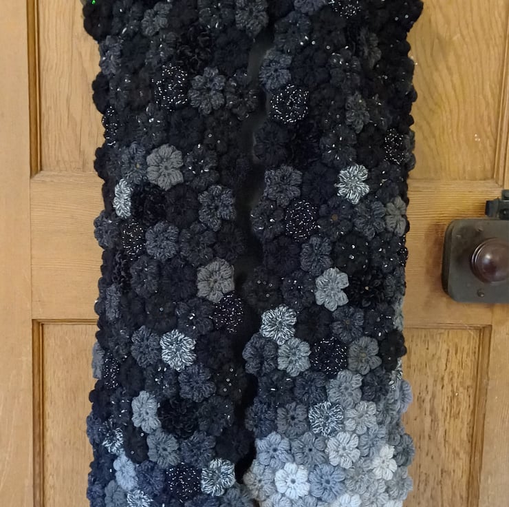 I love to make these, I create them row by row and carefully choose each crocheted flower to be placed in its final, perfect position before sewing it in place making each scarf individual and unique.