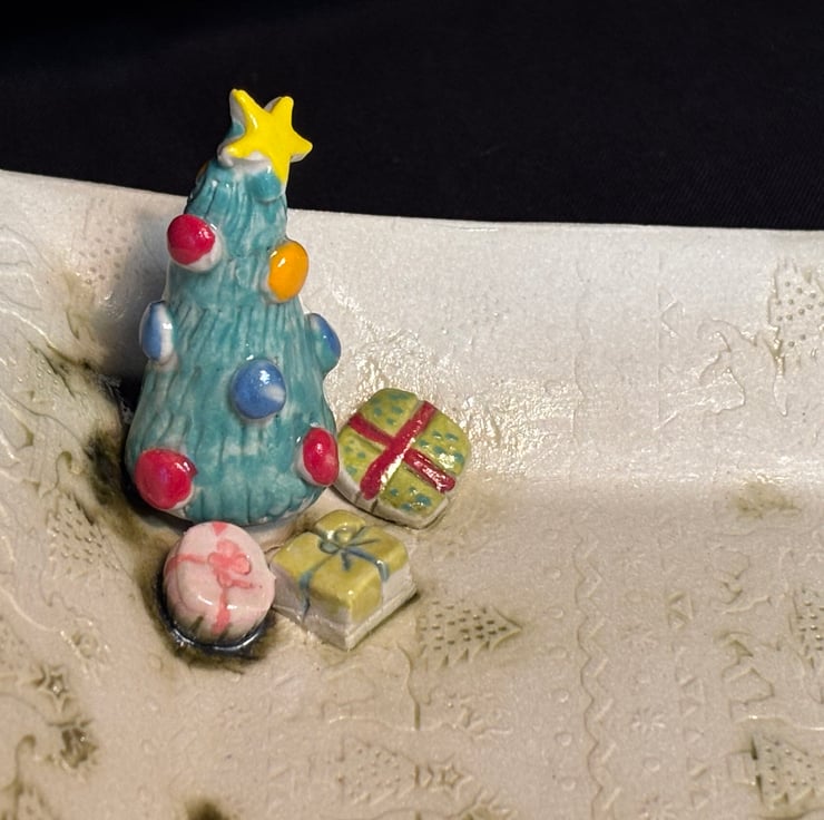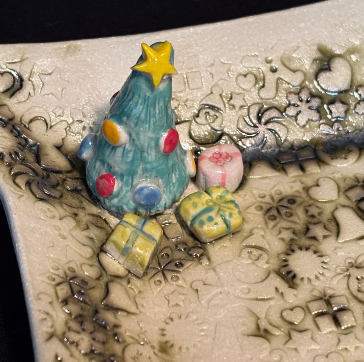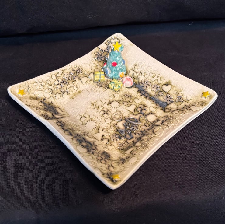 Square dish decorated with festive embossing, Christmas tree and tiny presents. Perfect for a tea light, small snacks or trinket dish.