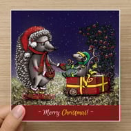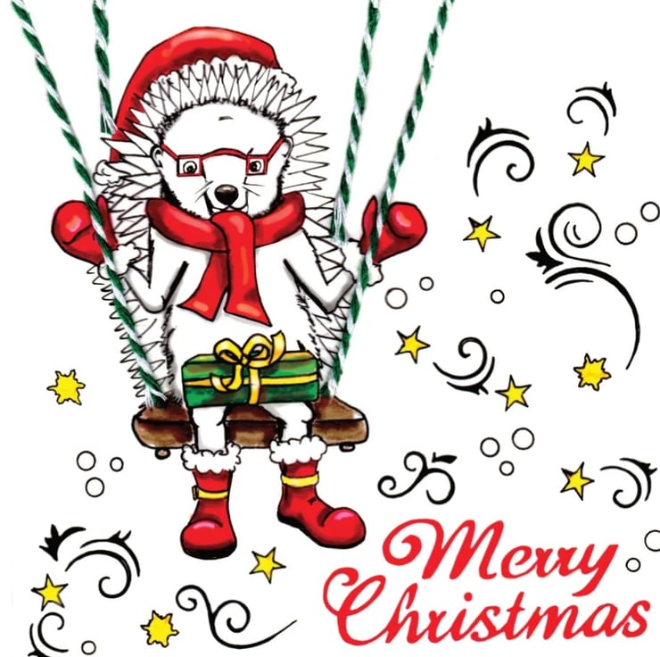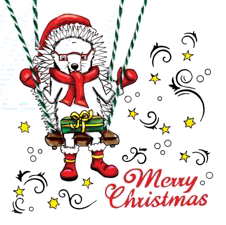 This beautifully illustrated Christmas card features my illustration of hedgehog Dougal in a Christmas outfit, sitting on a swing, with a wrapped gift on his lap. The card was hand-illustrated by me, and I glued on the cotton cord swing ropes for 3D effects. The card comes printed on quality, gloss paper, along with an envelope. The card dimensions are: 14 cm x 14 cm.