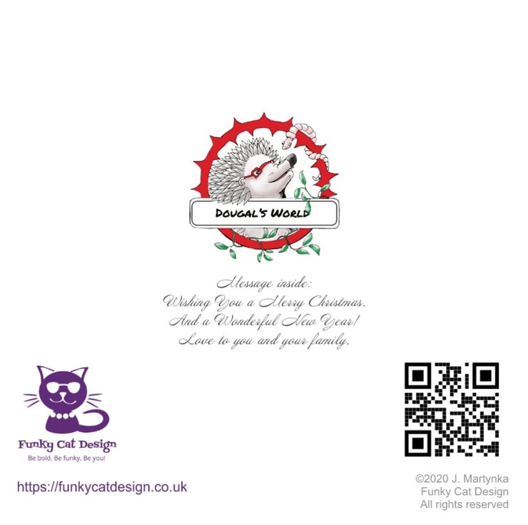 This beautifully illustrated Christmas card features my personal design of a hedgehog, whom I named Dougal. The inspiration comes from the time when we were rescuing and fostering hedgehogs, working with the local charities across Hampshire and Wiltshire. I originally came up with hedgehog Dougal back in 2016, and continued to draw him in all kinds of realistic and fantastic scenarios. Back in 2019 - 2020, I also created calendars and mugs with Dougal, and there was also a website about him: https://www.dougalsworld.co.uk, which was kindly hosted by a colleague. (The website may still be around, but I have not maintained it since.)