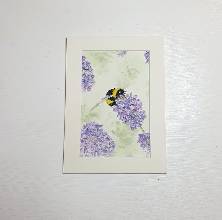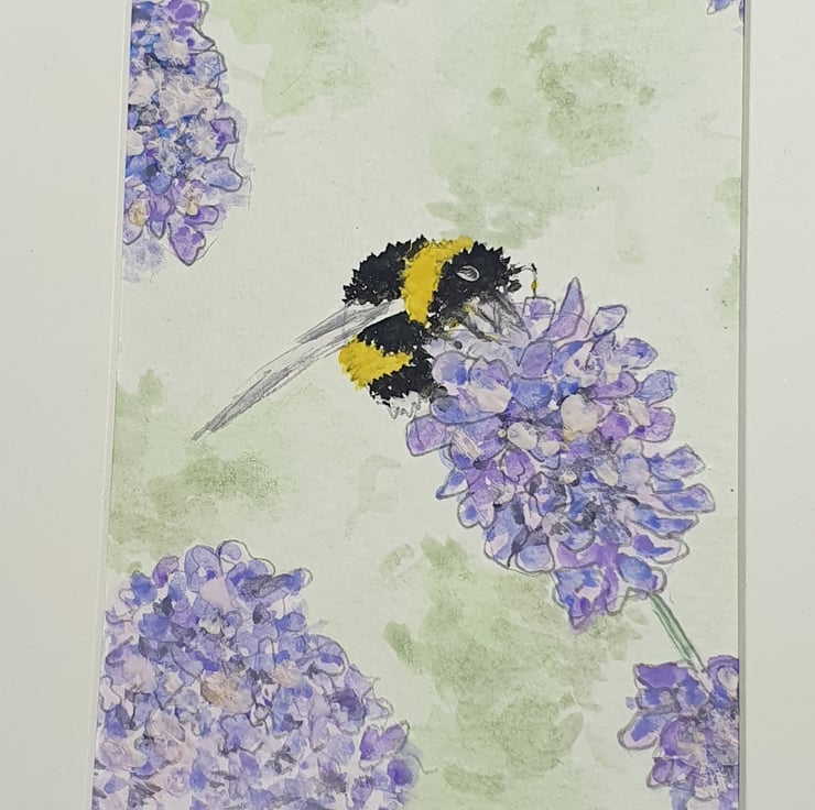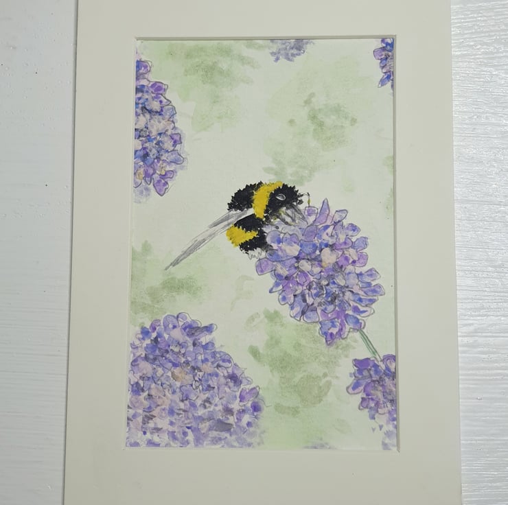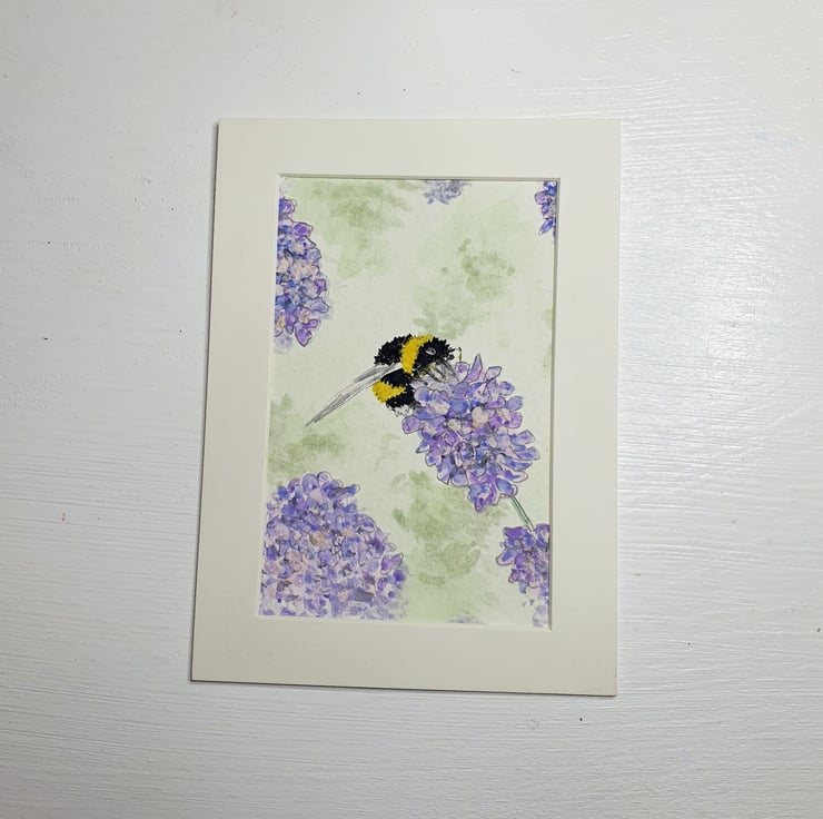 An original sketch in pencil of a bee enjoying the Lavender nectar. Copied from a photo. Hand painted in watercolour.