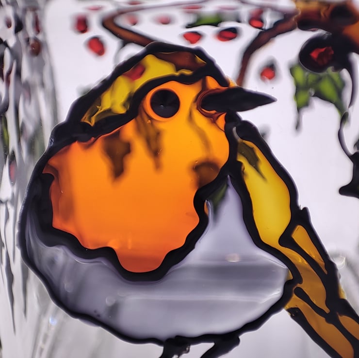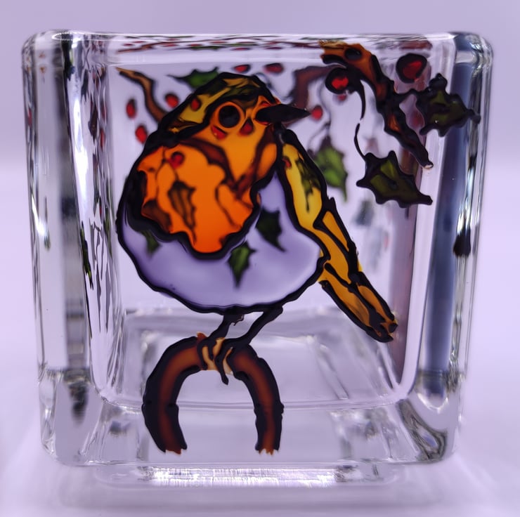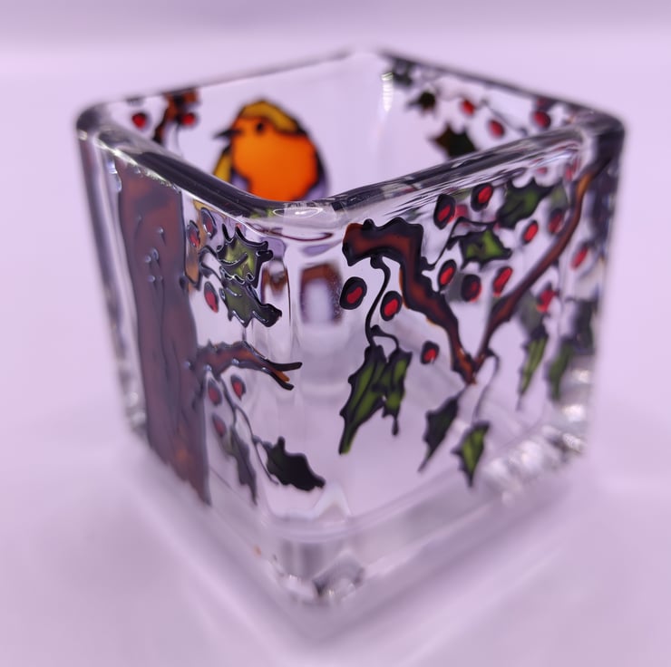 Small candle holder, 5cm x 5cm, hand painted glass depicting a robin in a holly tree