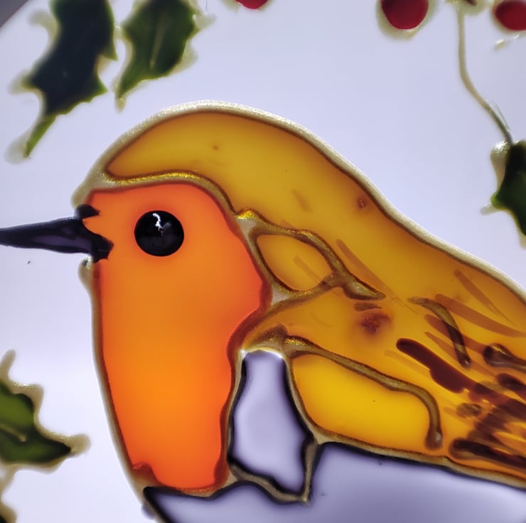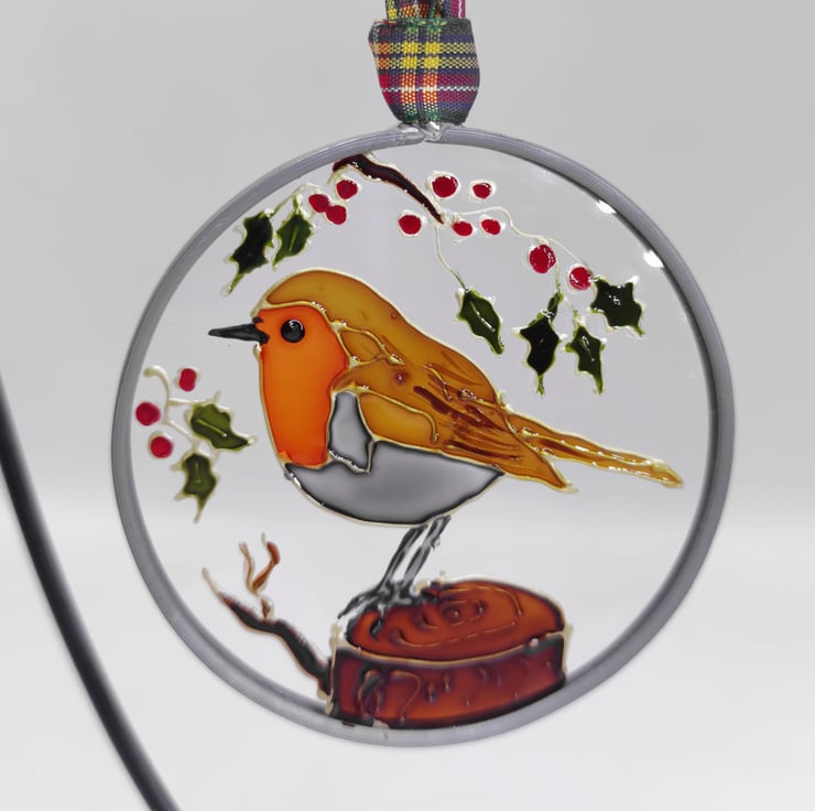 Hand painted using specialised glass paints, this roundel can be hung on a Christmas tree or in a window all year round. This one features a robin, perched in the holly. It is made from glass sheet, cut into a circle with a lead edging soldered on and hangs from a tartan ribbon. It's approximately 7cm diameter.