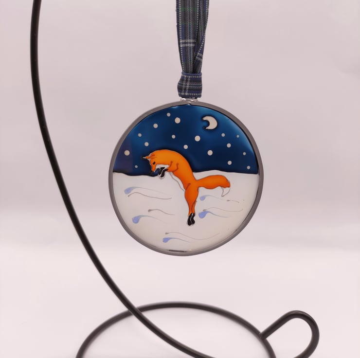 Hand painted using specialised glass paints, this roundel can be hung on a Christmas tree or in a window all year round. This one features a red fox hunting in the snow. It is made from glass sheet, cut into a circle with a lead edging soldered on and hangs from a tartan ribbon. It's approximately 7cm diameter.