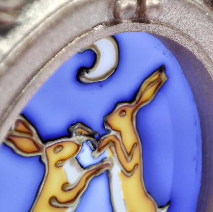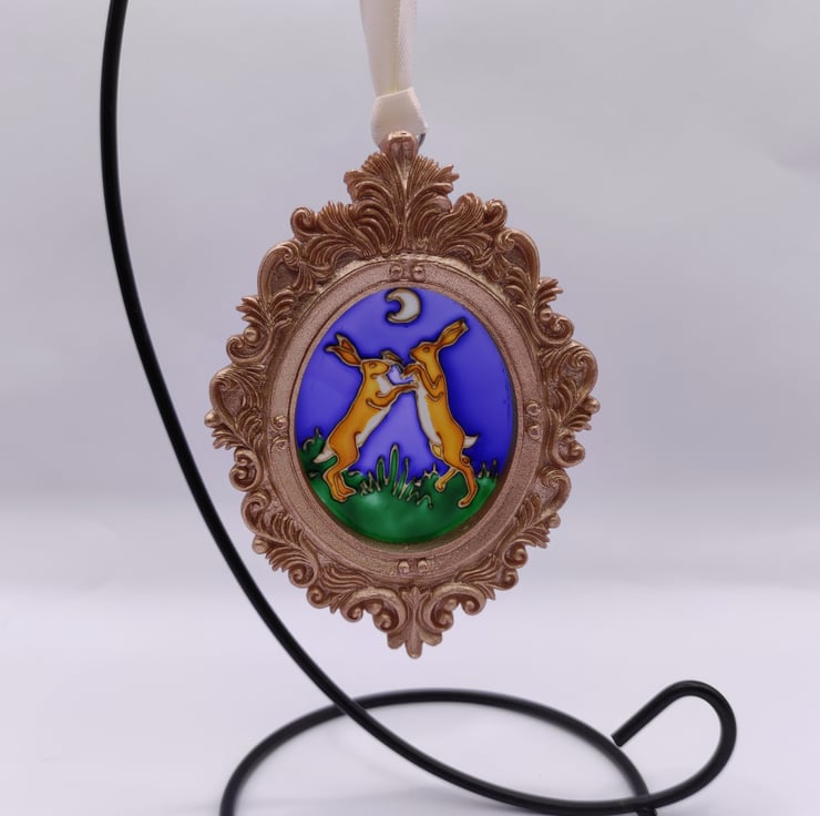 Hand painted using specialised glass paints, this mini painting with it's baroque style frame can be hung on a Christmas tree or in a window all year round. Hares boxing under a moonlit sky.