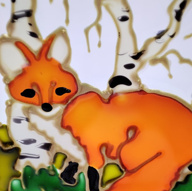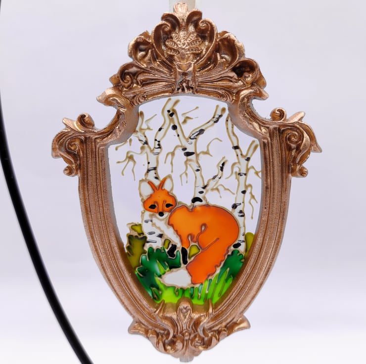 Hand painted using specialised glass paints, this mini painting with it's baroque style frame can be hung on a Christmas tree or in a window all year round. Red fox in the birch woods.