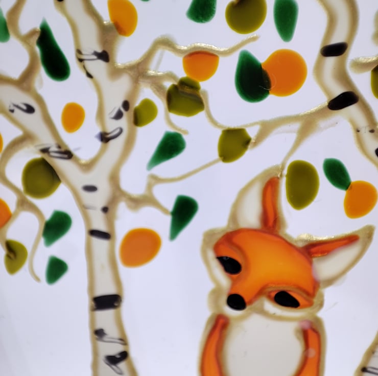 Hand painted using specialised glass paints, this mini painting with it's baroque style frame can be hung on a Christmas tree or in a window all year round. Red fox in the autumn birch woods.