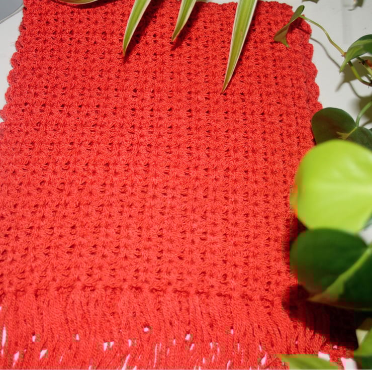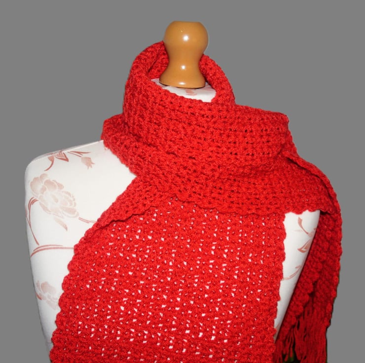 The scarf is a bright 'blood orange' autumnal/winter shade. It is very soft and vibrant and would add an extra cheerful lift to your winter wardrobe. The scarf measures approximately 62 inches length (including tassels) and 11 inches width. I will send the care instructions with your parcel. Made with the kind permission of the original pattern designer.