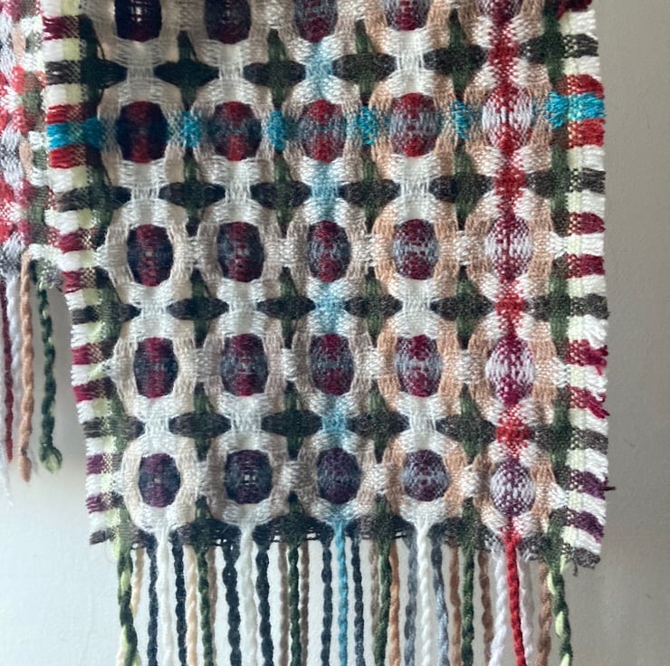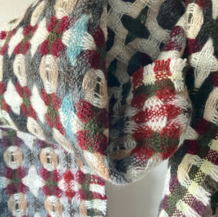 Handwoven Lambswool Scarf in Red and Green, Golfballs