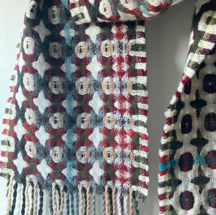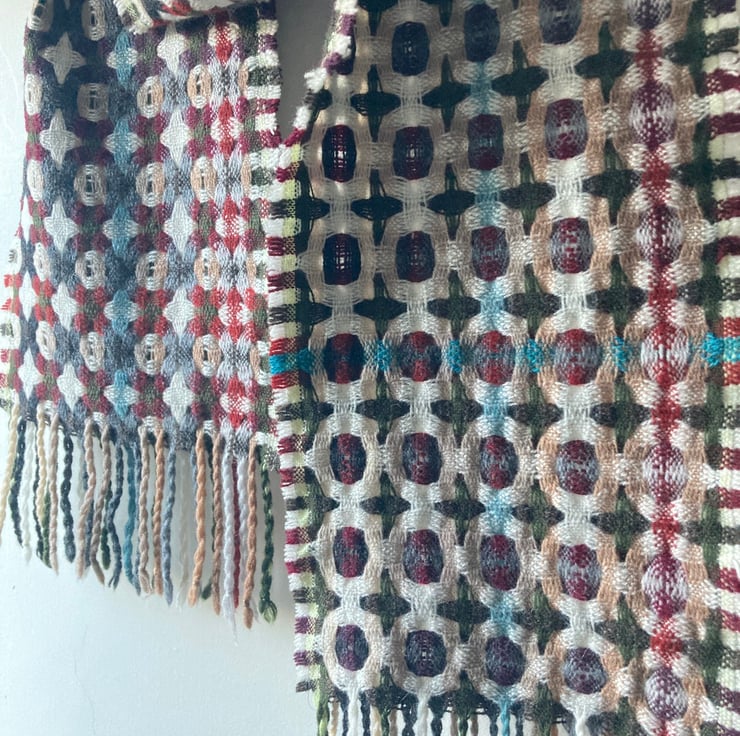 A handwoven scarf in the softest merino lambswool, in a deflected doubleweave draft in graduated shades of red and green with accents of teal and seaspray. The structure produces a double-sided and lightweight scarf that is versatile and practical.