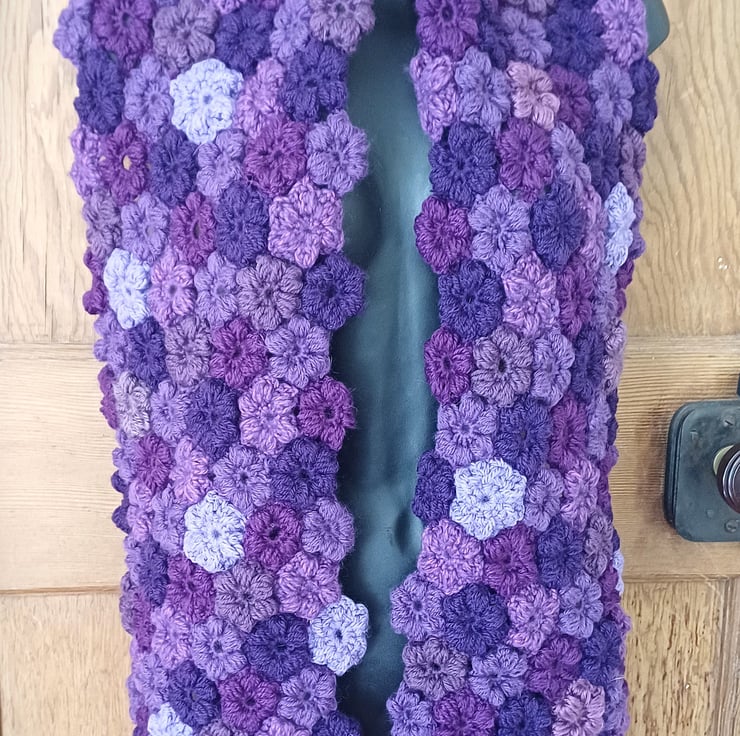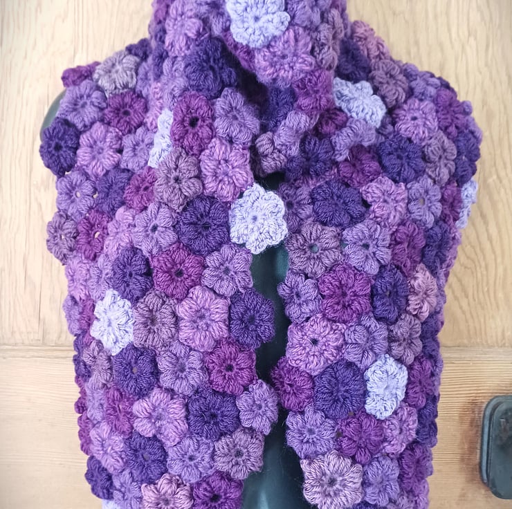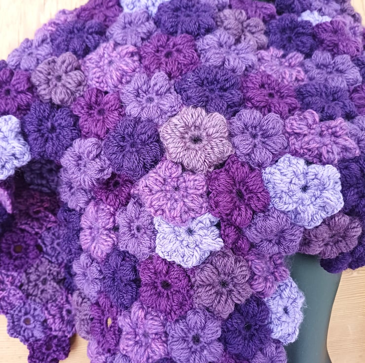 I love to make these, I create them row by row and carefully choose each crocheted flower to be placed in its final, perfect position before sewing it in place making each scarf individual and unique.