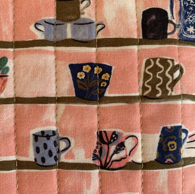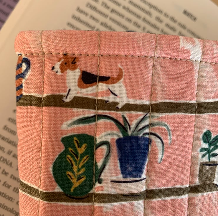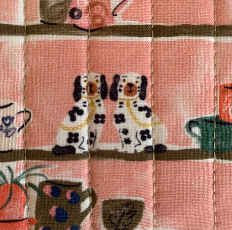 It is made with this fun shelves design fabric featuring dogs, vases, mugs and pot plants on a salmon colour background.