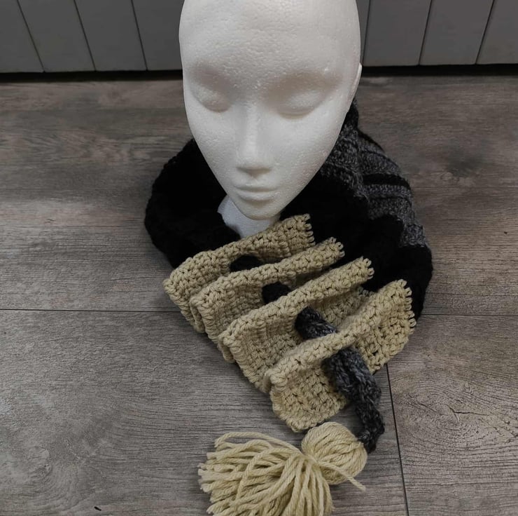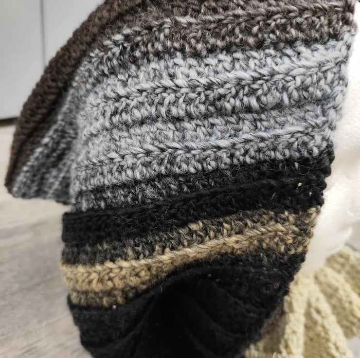 Made using 1yarn in gorgeous greys finished with parchment colour to add contrast.