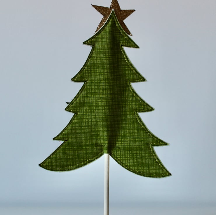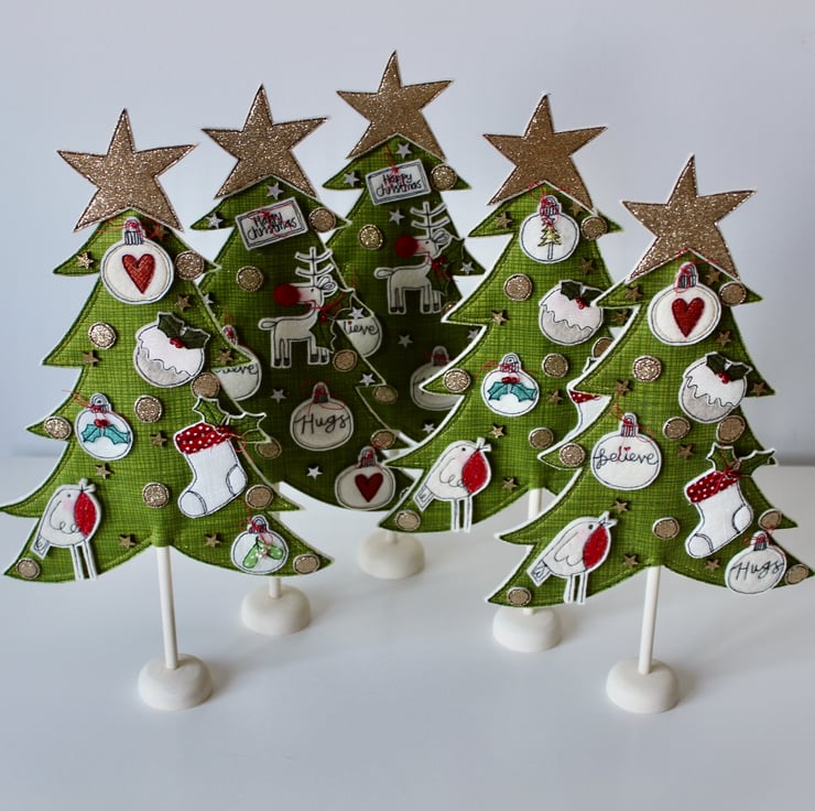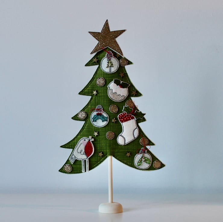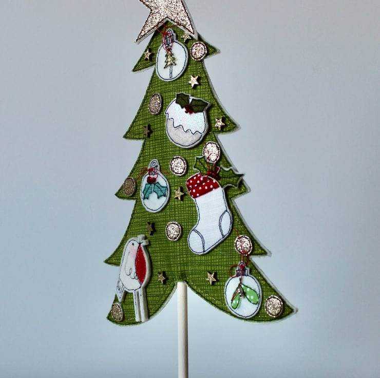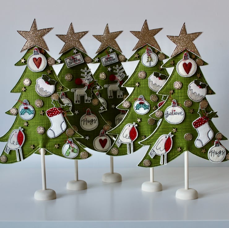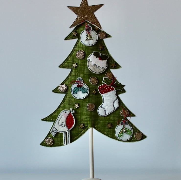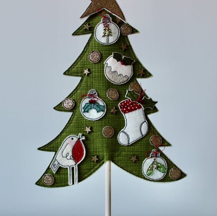 A delightful decoration which is created using 100% wool felt, cotton cloth, glitter cloth, free hand machine embroidery and cut out by hand, using a very sharp pair of scissors.