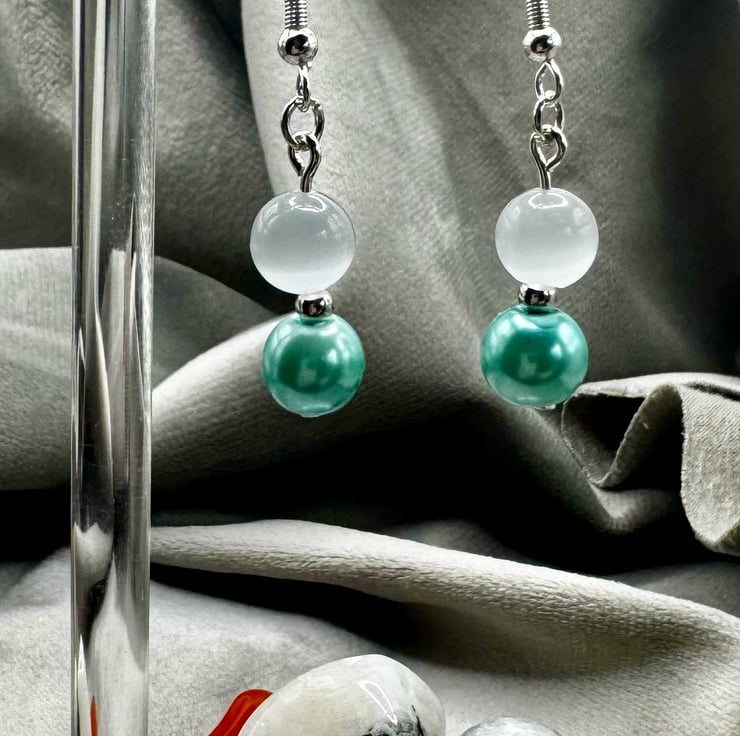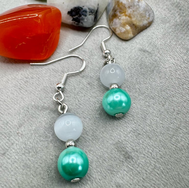 light green glass pearl and white moonstone earrings on sterling silver hooks